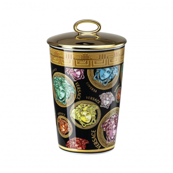 Candeliere con candela profumata, appartenente alla collezione Medusa Amplified Multicolour, realizzato in finissima porcellana decorata. Questo candeliere presenta un meraviglioso decoro dorato raffigurante l'iconica "Greca" di Versace. Ulteriormente arricchito da Piccole Meduse coloratissime che sembrano galleggiare sull'intera superficie del candeliere unitamente al logo Versace, variamente ripetuto. Ogni iconica "Medusa" ha dimensioni differenti, capaci di creare un meraviglioso effetto ottico. Elegante, raffinato ed emozionante, il candeliere con candela profumata Medusa Amplified Multicolour trasferirà ad ogni tavola glamour, lusso e raffinatezza. Disegnato e realizzato da Versace Rosenthal.