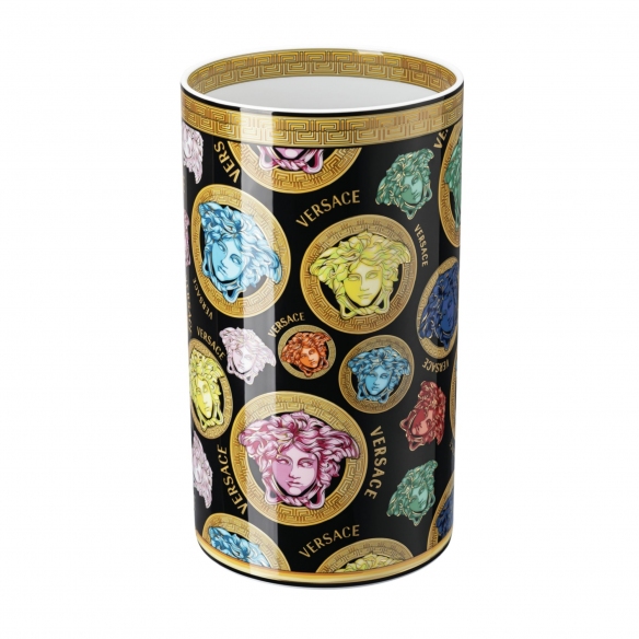 Vaso, appartenente alla collezione Medusa Amplified Multicolour, realizzato in finissima porcellana decorata. Questo vaso presenta un meraviglioso decoro dorato raffigurante l'iconica "Greca" di Versace. Ulteriormente arricchita da Piccole Meduse coloratissime che sembrano galleggiare sull'intera superficie del vaso unitamente al logo Versace, variamente ripetuto. Ogni iconica "Medusa" ha dimensioni differenti, capaci di creare un meraviglioso effetto ottico. Elegante, raffinato ed emozionante, Il vaso Medusa Amplified Multicolour trasferirà ad ogni arredo o tavola glamour, lusso e raffinatezza. Disegnato e realizzato da Versace Rosenthal.