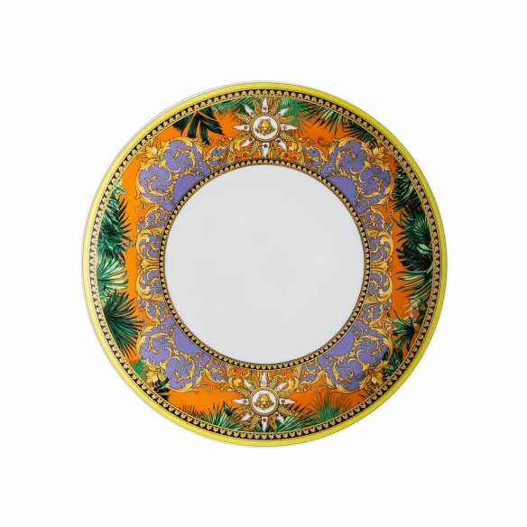 Piatto piano dal diametro di 28 cm, appartenente alla collezione Jungle Aminalier, realizzato in finissima porcellana decorata. Il piatto Jungle Animalier è adornato dal classico pattern della collezione, con grandi foglie e fiori esotici. La ciliegina sulla torta è rappresentata da un piccolo sole che racchiude l'iconica "Medusa" di Versace. Un accessorio perfetto per gli amanti dello stile sopraffino. Questo piatto darà alla tua tavola un tocco selvaggio e ti farà viaggiare verso posti lontani! Disegnato e realizzato da Rosenthal Versace.