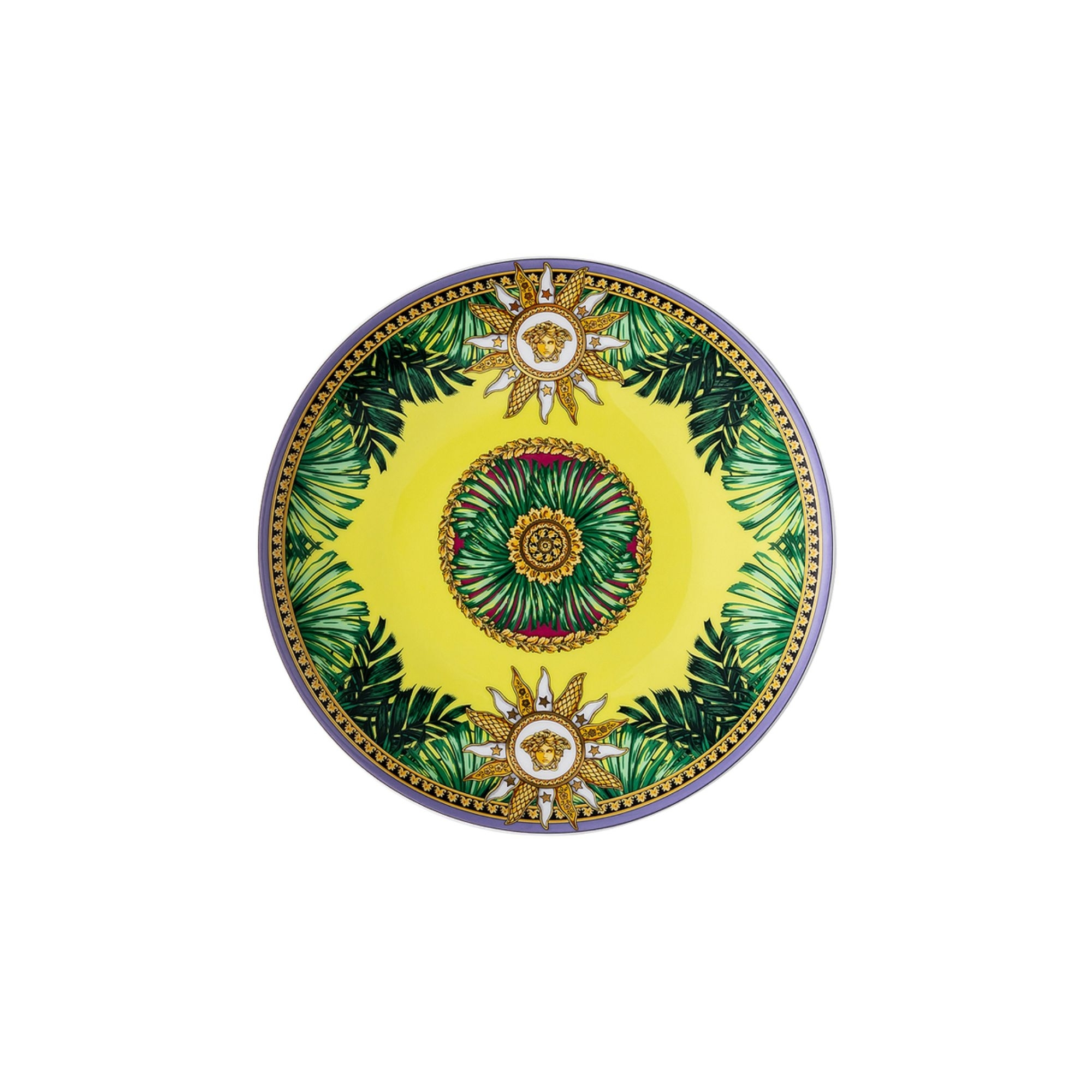 Piatto piano dal diametro di 17 cm, appartenente alla collezione Jungle Aminalier, realizzato in finissima porcellana decorata. Il piatto Jungle Animalier è adornato dal classico pattern della collezione, con grandi foglie e fiori esotici. La ciliegina sulla torta è rappresentata da un piccolo sole che racchiude l'iconica "Medusa" di Versace. Un accessorio perfetto per gli amanti dello stile sopraffino. Questo piatto darà alla tua tavola un tocco selvaggio e ti farà viaggiare verso posti lontani! Disegnato e realizzato da Rosenthal Versace.