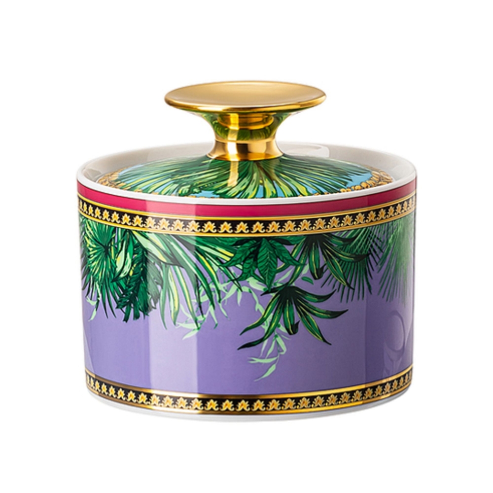 Zuccheriera, appartenente alla collezione Jungle Animalier, realizzata in finissima porcellana decorata. Il pattern di questa meravigliosa zuccheriera riprende i motivi della collezione Jungle Animalier, grandi foglie di palma su un background viola sgargiante. Impreziosita, ulteriormente, da un pomolo dorato. La zuccheriera Jungle Animalier addolcirà le tue pause tè o caffè, oltre a farti viaggiare verso luoghi esotici e lontani. Abbinala con gli altri accessori da cucina della stessa collezione per completarne il valore estetico. Disegnata e Realizzata da Rosenthal Versace.