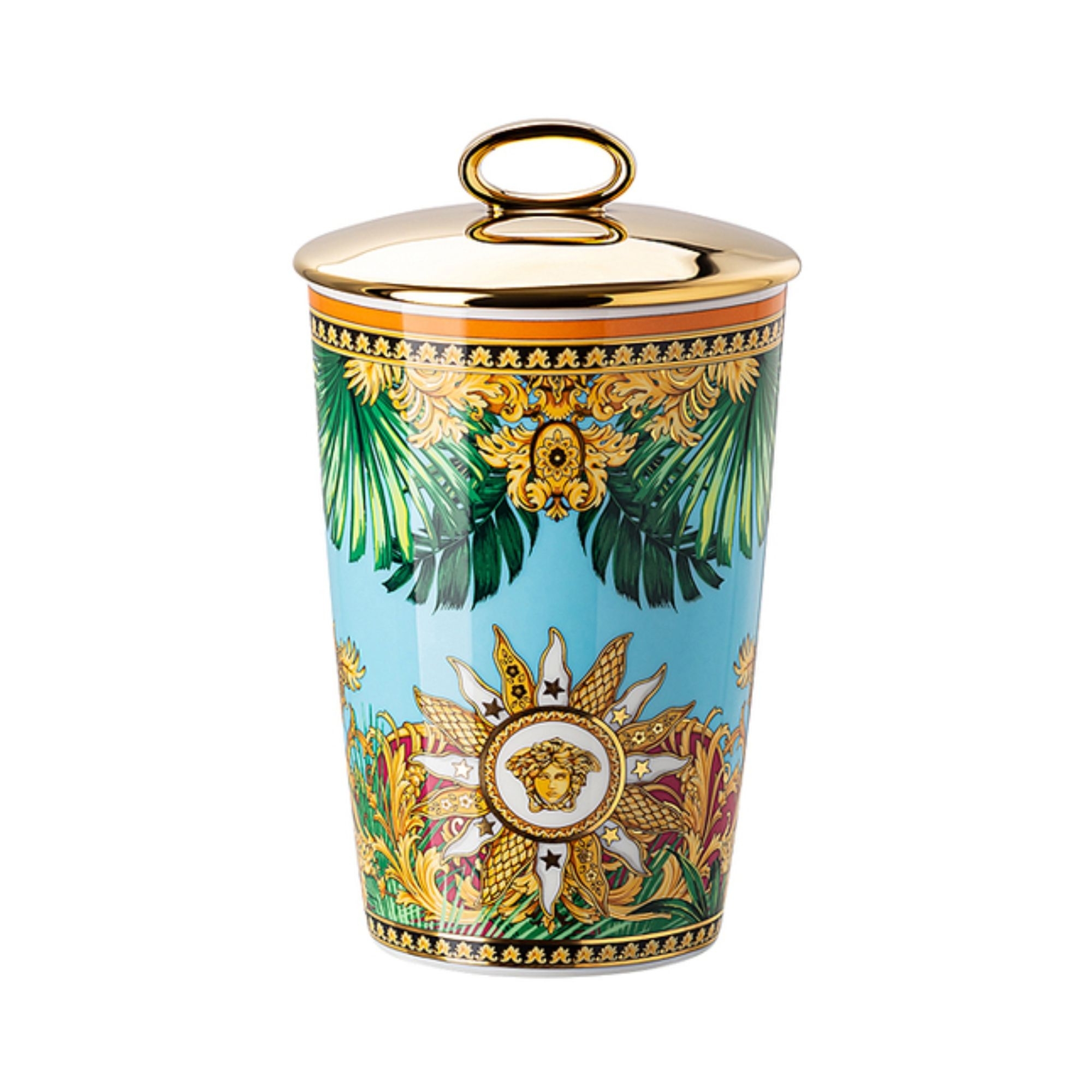 Candeliere con candela profumata, appartenente alla collezione Jungle Animalier, realizzato in finissima porcellana decorata. Un eccezionale complemento d'arredo, il candeliere presenta la fantasia Jungle Animalier in una palette di colori brillanti. Spiccano i classici decori dorati della famosa casa di moda, accompagnati da grandi foglie e fiori esotici. In basso c'è un sole che racchiude l'iconica "Medusa" di Versace. Il candeliere Jungle Animalier si adatta a tutti gli arredamenti più estrosi e ti farà viaggiare verso luoghi esotici e lontani! Disegnato da Rosenthal Versace.