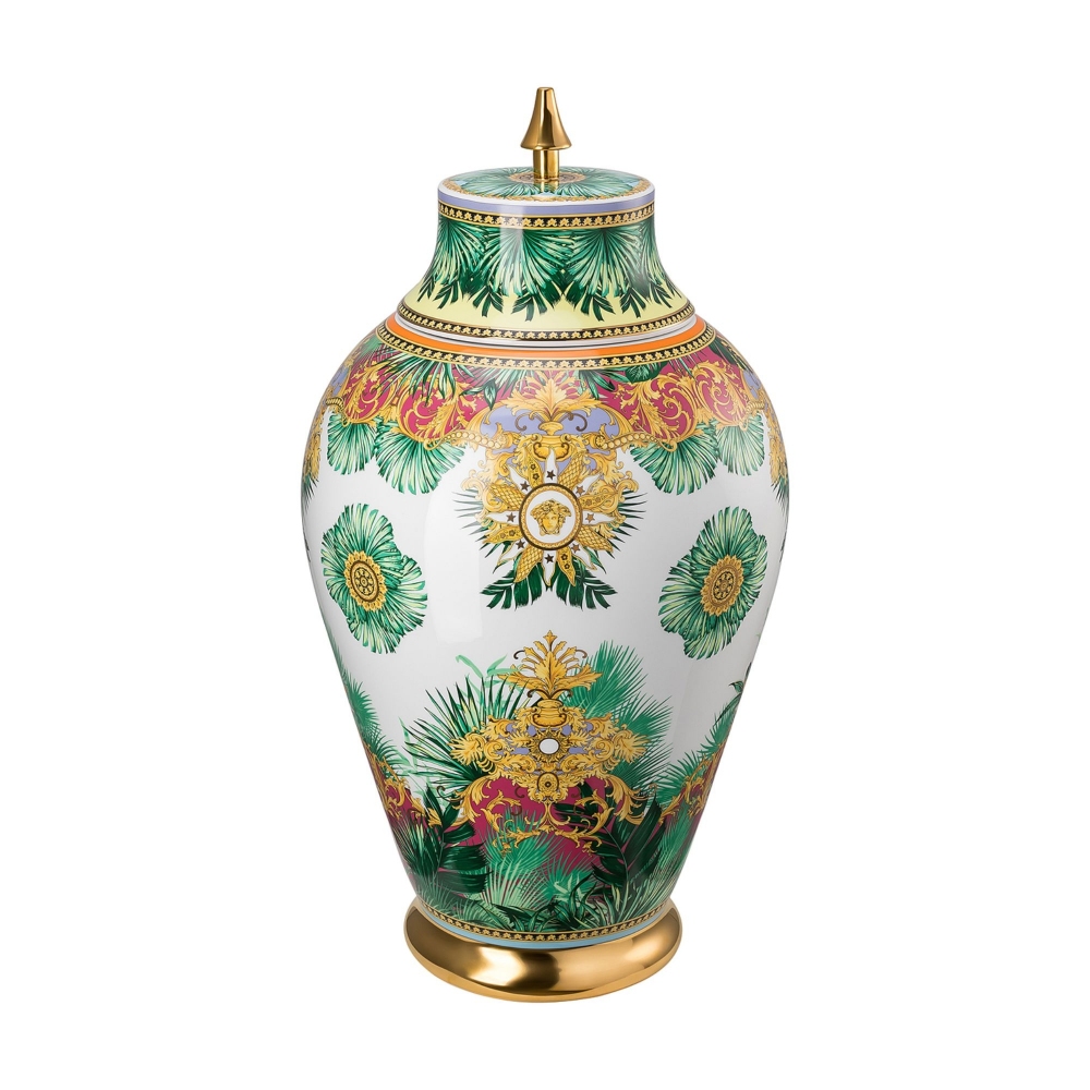 Vaso con coperchio, appartenete alla collezione Jungle Animalier, realizzata in finissima porcellana decorata. Il vaso Jungle Animalier è decorato su fondo bianco con i classici decori della collezione; la decorazione così fitta e ricca di dettagli lo rende adatto ad ogni arredamento. Questo vaso ha le sembianze di un antico accessorio dell'età classica greco-romana, ma con dei decori che lo rendono perfettamente attuale. Al centro un sole sgargiante con il volto della iconica "Medusa" di Versace, all'interno. Disegnato e realizzato da Rosenthal Versace