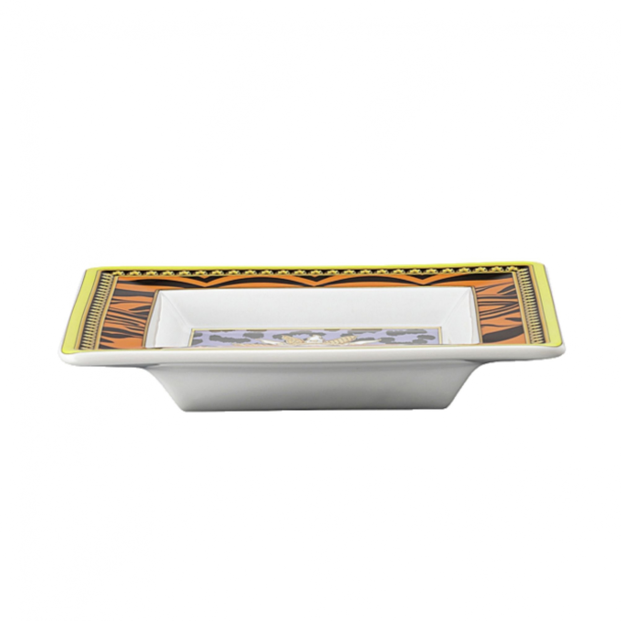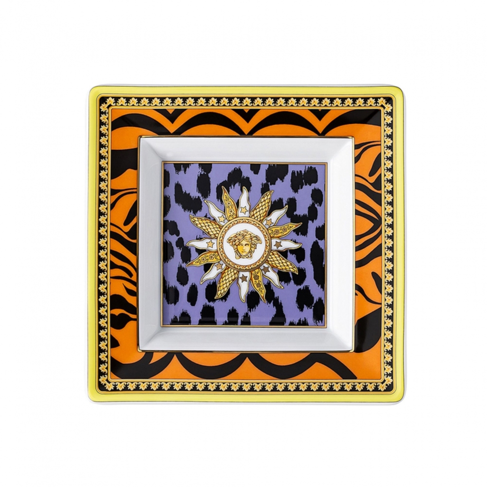 Coppa quadrata 14x14 cm, appartenente alla collezione Jungle Animalier, realizzata in finissima porcellana decorata. Perfetta sia come funzionale accessorio da tavola, sia come elegante complemento d'arredo, la coppa Jungle Animalier si presenta con un design molto ricco, ricco di colori brillati e decori suggestivi. Spiccano i classici decori dorati della famosa casa di moda, accompagnati da disegni suggestivi, con foglie e altri dettagli che si ispirano alla giungla. La ciliegina sulla torta è rappresentata da un piccolo sole che racchiude l'iconica "Medusa" di Versace. Un accessorio perfetto per gli amanti dello stile sopraffino. Realizzata da Versace Rosenthal.