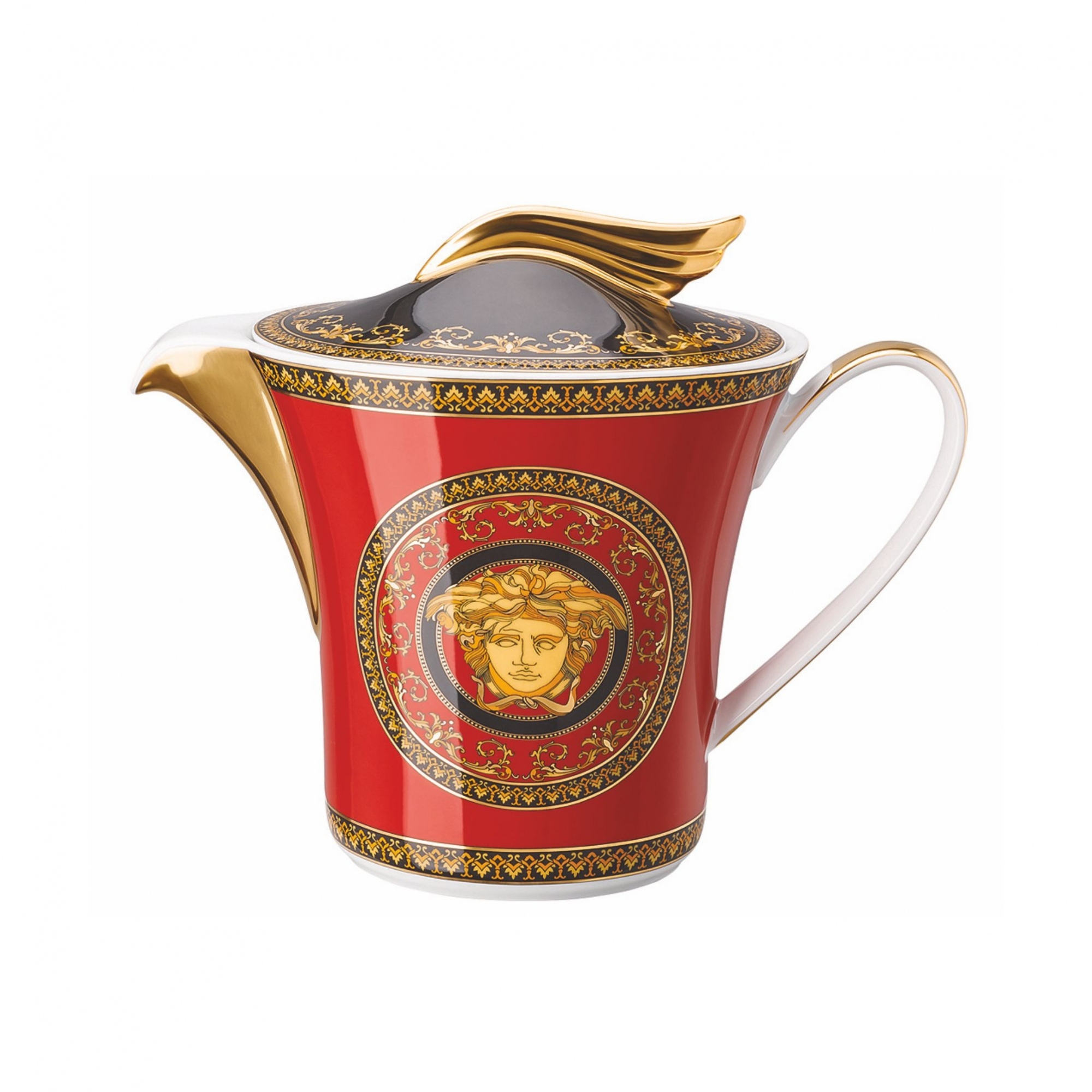 Teiera, appartenente alla collezione Medusa, realizzata in finissima porcellana decorata. Iconica e raffinata, la teiera Medusa si presenta con un design lussuoso: le decorazioni dorate e nere sono intricate in un acceso sfondo di colore rosso, in grado di spiccare in qualsiasi contesto. Inoltre, non manca l'antico bordo Barocco color oro e l'iconico logo "Medusa" di Versace, che la rendono un pezzo molto fine, una perfetta aggiunta a qualsiasi collezione! Disegnata e realizzata da Rosenthal Versace.