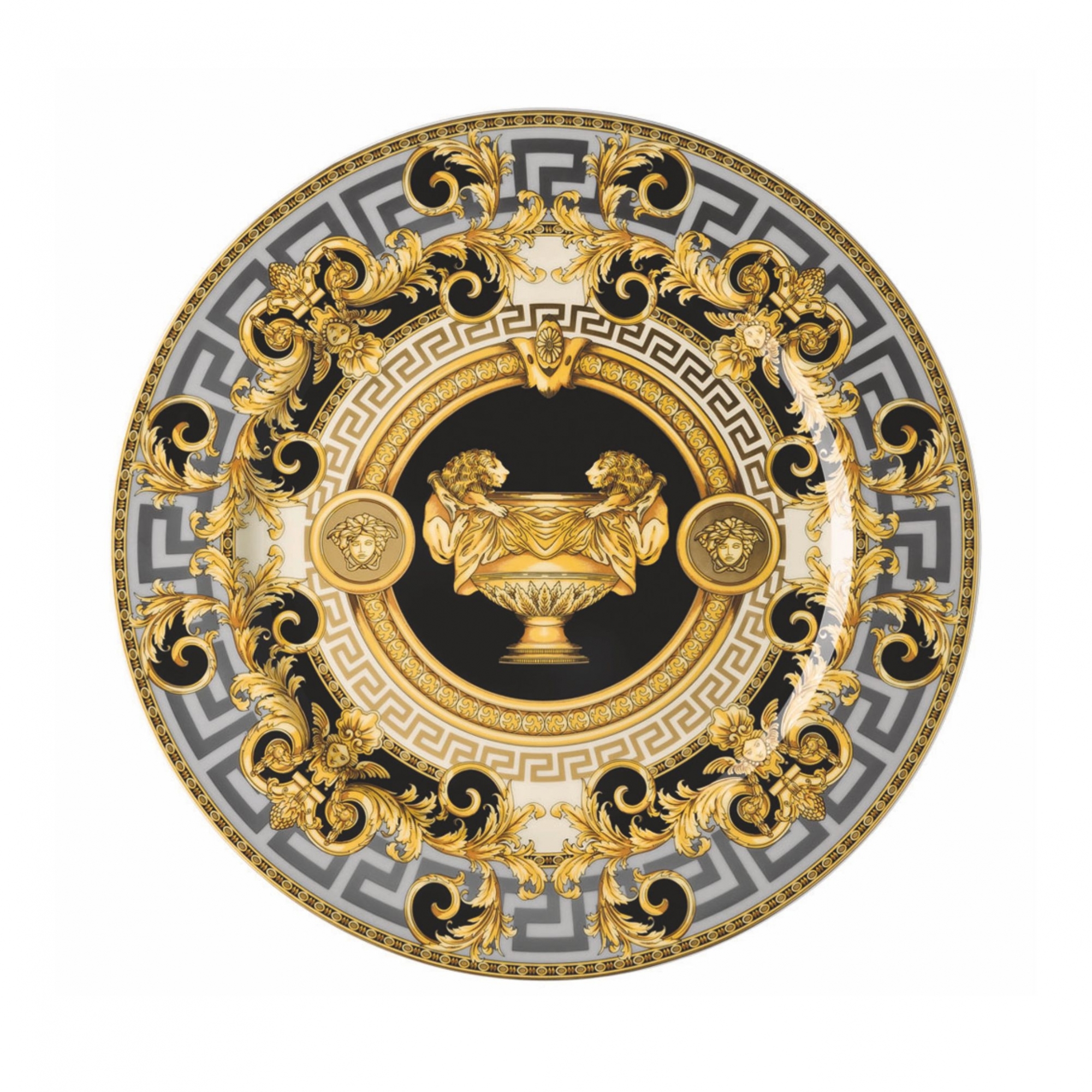 Piatto segnaposto dal diametro di 30 cm, appartenente alla collezione Prestige Gala, realizzato in finissima porcellana decorata. Arricchito dal decoro Prestige Gala 2, il piatto il piatto piano Prestige Gala presenta pregiati elementi dallo stile barocco, messi in risalto da affascinanti dettagli in oro, grigio e nero, ed accompagnati da classici motivi in chiave Greca, come l'iconica Medusa Versace. Brillante, resistente e indistruttibile, il piatto Prestige Gala dominerà la tua tavola! Realizzato da Rosenthal Versace.