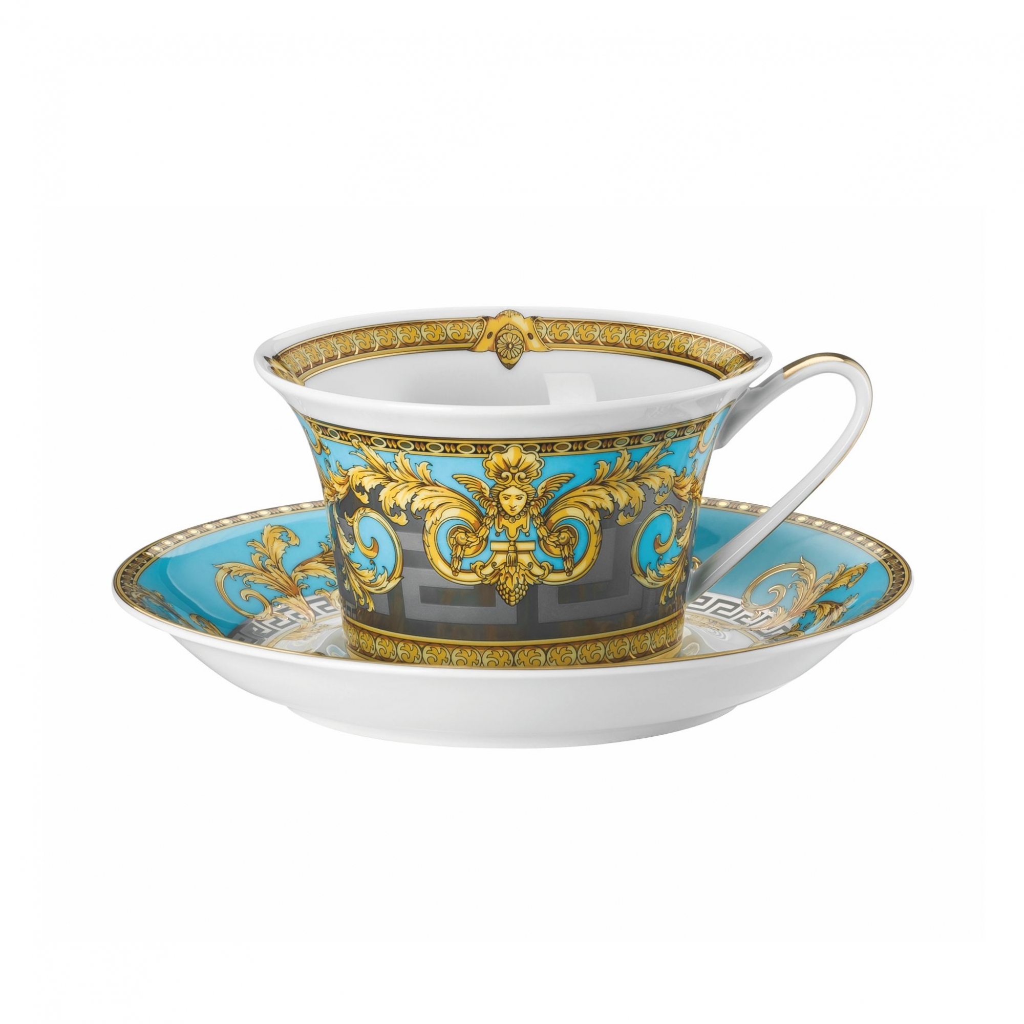 Tazza da tè comprensiva di piattino, appartenente alla collezione Prestige Gala, realizzata in finissima porcellana decorata. Con una capacità di 22 cl, questa splendida tazza ti permetterà di godere del rituale del tè con stile, grazie al design suggestivo che la contraddistingue. Favolosi motivi in oro, grigio e azzurro arricchiscono l'intero oggetto, conferendogli un'eleganza assoluta. Realizzata da Versace Rosenthal.