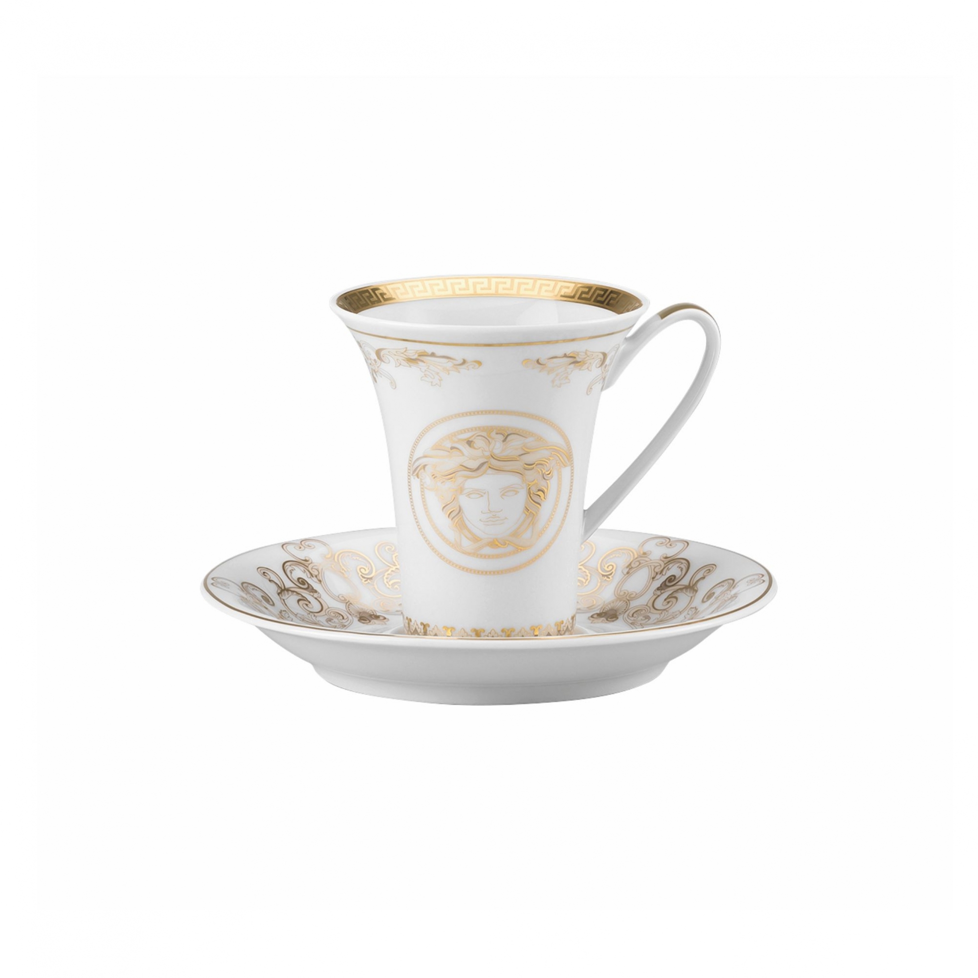 Tazza da caffè comprensiva di piattino, realizzata in finissima porcellana. Con una capacità di 9 cl, questa splendida tazza da caffè presenta delle fantastiche decorazioni in oro, su cui spicca la straordinaria immagine di Medusa, la Gorgone, uno dei simboli più famosi della mitologia greca e icona del brand Versace. Realizzata da Rosenthal Versace.