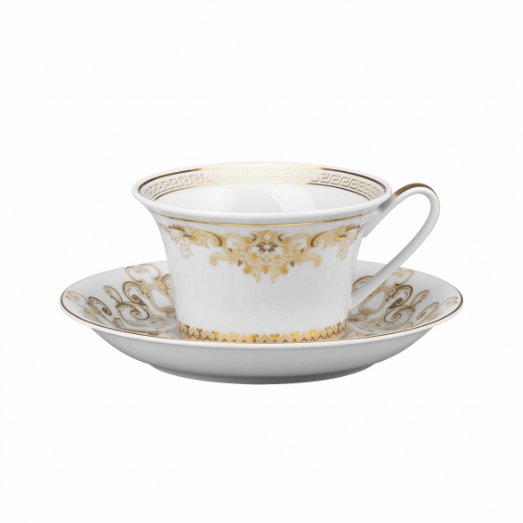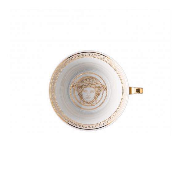 Tazza da tè comprensiva di piattino, appartenente alla collezione Medusa Gala. on una capacità di 22 cl, questa splendida tazza da tè presenta delle fantastiche decorazioni in oro, su cui spicca la straordinaria immagine di Medusa, la Gorgone, uno dei simboli più famosi della mitologia greca e icona del brand Versace. Realizzata da Rosenthal Versace.