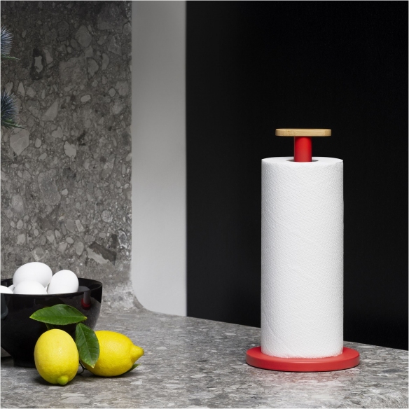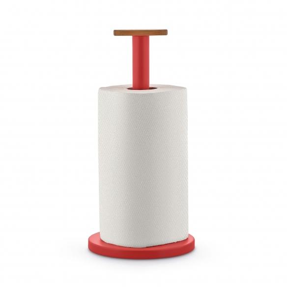 Portarotolo Mattina, realizzato in acciaio colorato con resina epossidica e pomolo in legno di bambù. Disponibile nelle finiture rosso e grigio, il portarotolo Mattina si presenta con un design minimale, che comprende diversi dettagli progettati per incrementarne la funzionalità. Colorato e poco ingombrante, il portarotolo Mattina è una bellissima aggiunta in ogni cucina. Disegnato da Big Game per Alessi.