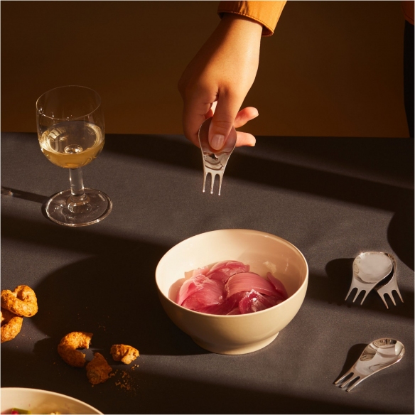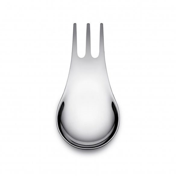 Posata multiuso Moscardino, realizzata in acciaio inossidabile 18/10. Molto particolare e suggestiva, questa posata è una vera e propria innovazione nel suo genere, in quanto è in grado di sintetizzare in un unico strumento due utensili: forchetta e cucchiaio. Moscardino è utile per consumare un pasto veloce, un pranzo in piedi o un aperitivo informale. Disegnata da Giulio Iacchetti e Matteo Ragni per Alessi.