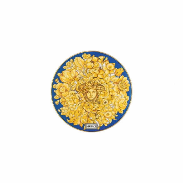 Piatto piano dal diametro di 17 cm, appartenente alla collezione Medusa Rhapsody, realizzato in finissima porcellana decorata. Disponibile in 3 pregiate finiture di colore, il piatto piano Medusa Rhapsody è perfetto sia come elegante posto tavola, sia come raffinato complemento d'arredo. Presenta un'elegante motivo Medusa centrale dorato, circondato da una composizione di fiori Barocco, ed è impreziosito ulteriormente dall'etichetta Versace. Realizzato da Versace Rosenthal.