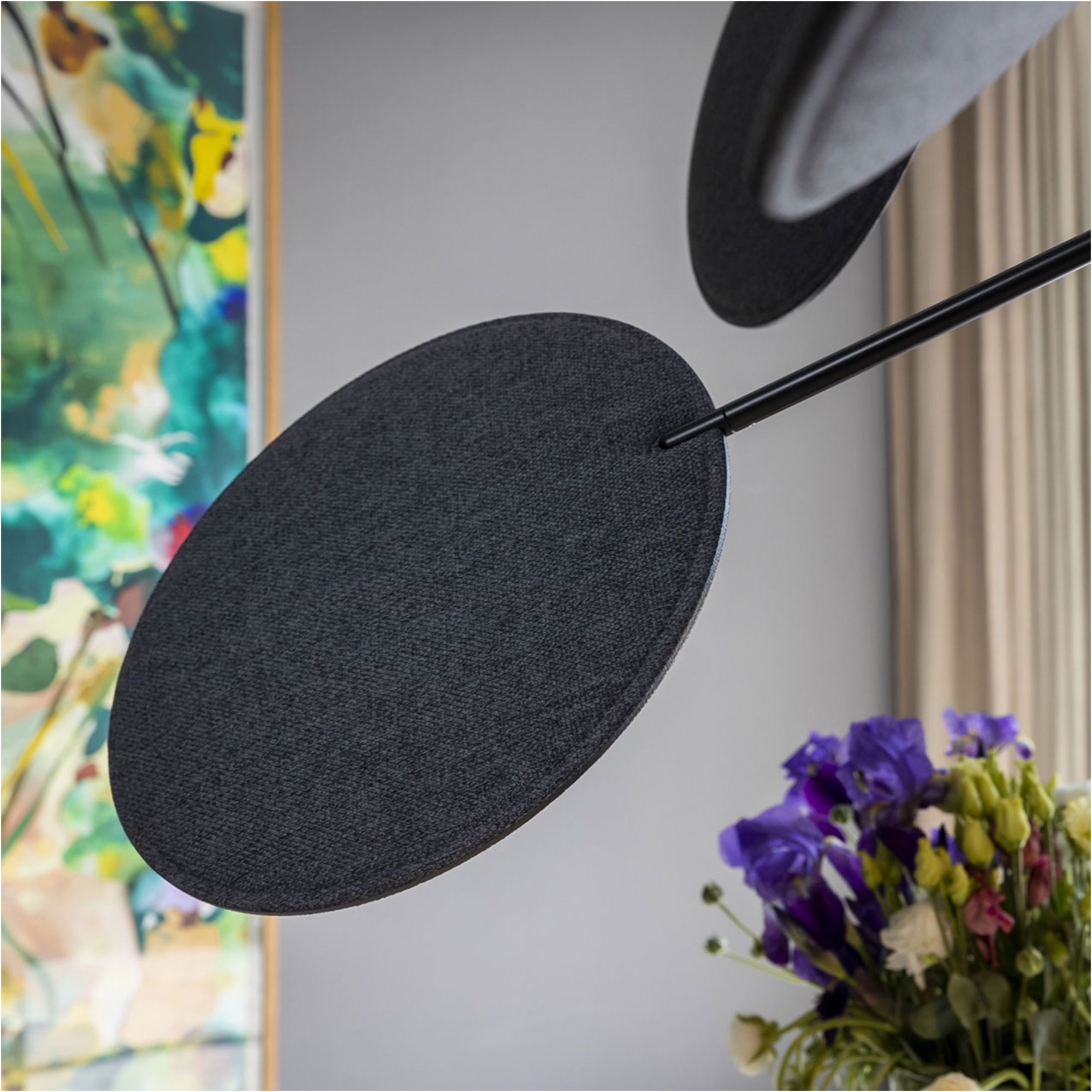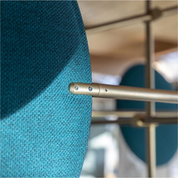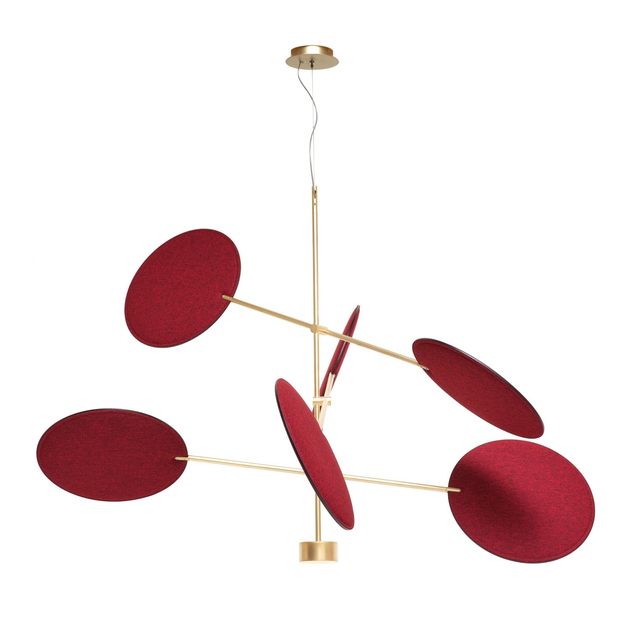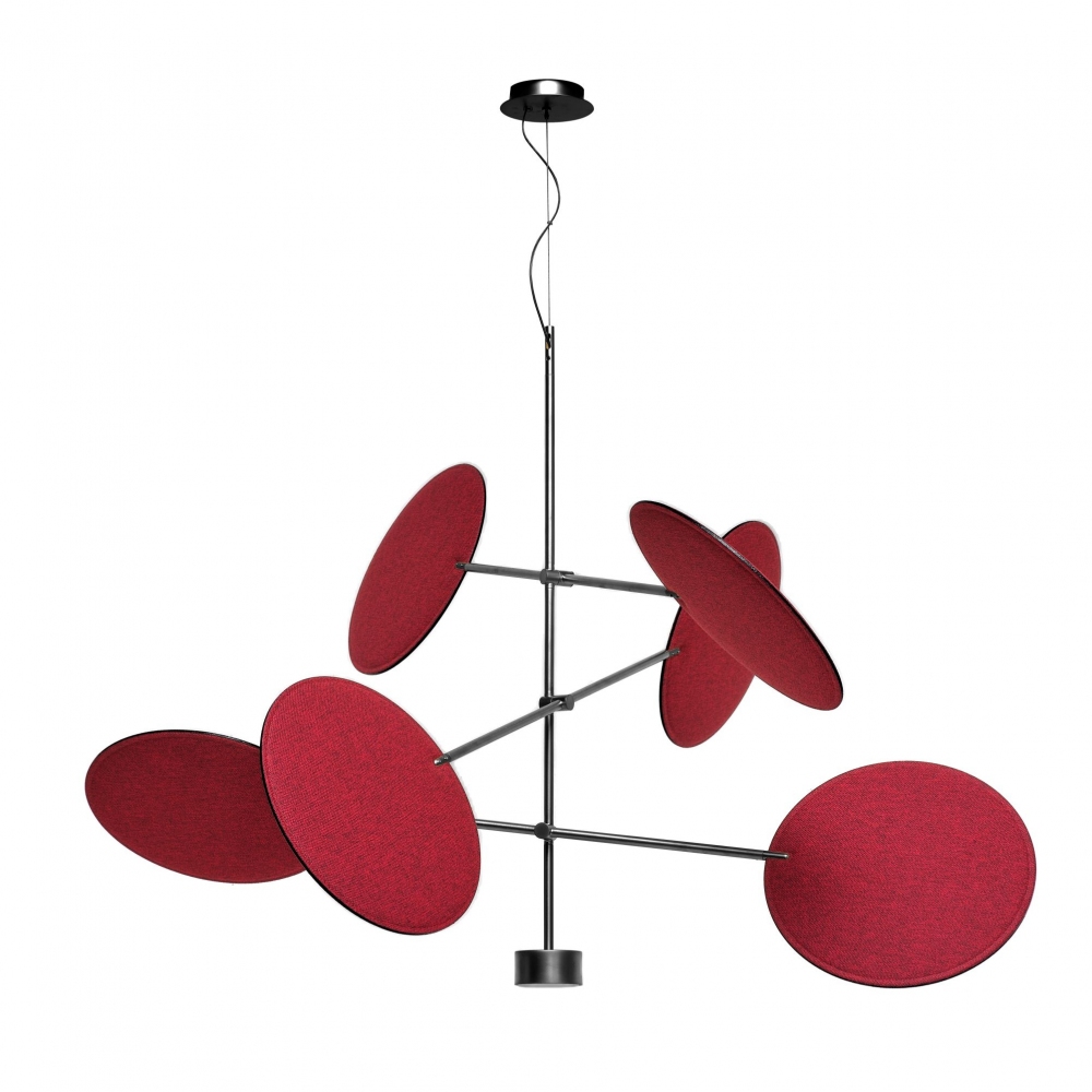 Lampada da soffitto appartenente alla collezione Diva, realizzata con struttura in metallo e dischi orientabili rivestiti in tessuto con proprietà fonoassorbenti. Disponibile in 2 finiture per quanto riguarda la struttura e in 6 finiture per quanto riguarda i dischi, la lampada da soffitto Diva si presenta con una forte personalità, proponendosi come la protagonista della sala da pranzo. I bracci sono orientabili a piacimento. Disegnata da Sebastiano Tosi per Mogg.