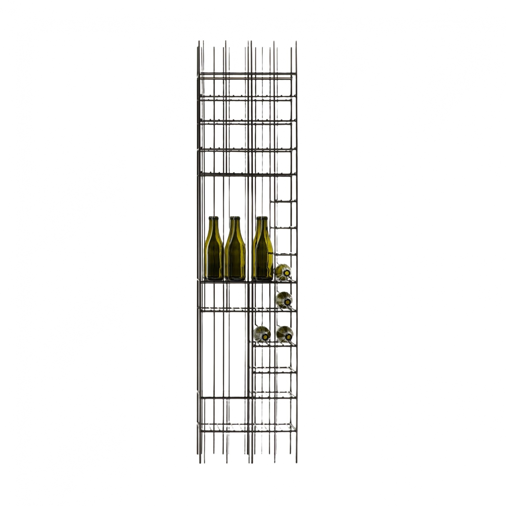Portabottiglie Metrica C "wine", realizzata in metallo. Complemento d'arredo dall'assoluta raffinatezza, la Metrica wine ti permetterà di posizionare la tua collezione di vini e bollicine con uno stile inaudito. Le bacchette di ferro fissate a diversi intervalli creano uno spazio da riempire, mentre le bottiglie ne completano la forma riscrivendo di volta in volta nuove composizioni. Completa di 3 ripiani in vetro di colore bronzo o verde e griglie portabottiglie. Richiede il fissaggio a parete. Disegnata da Ctrlzak per Mogg.