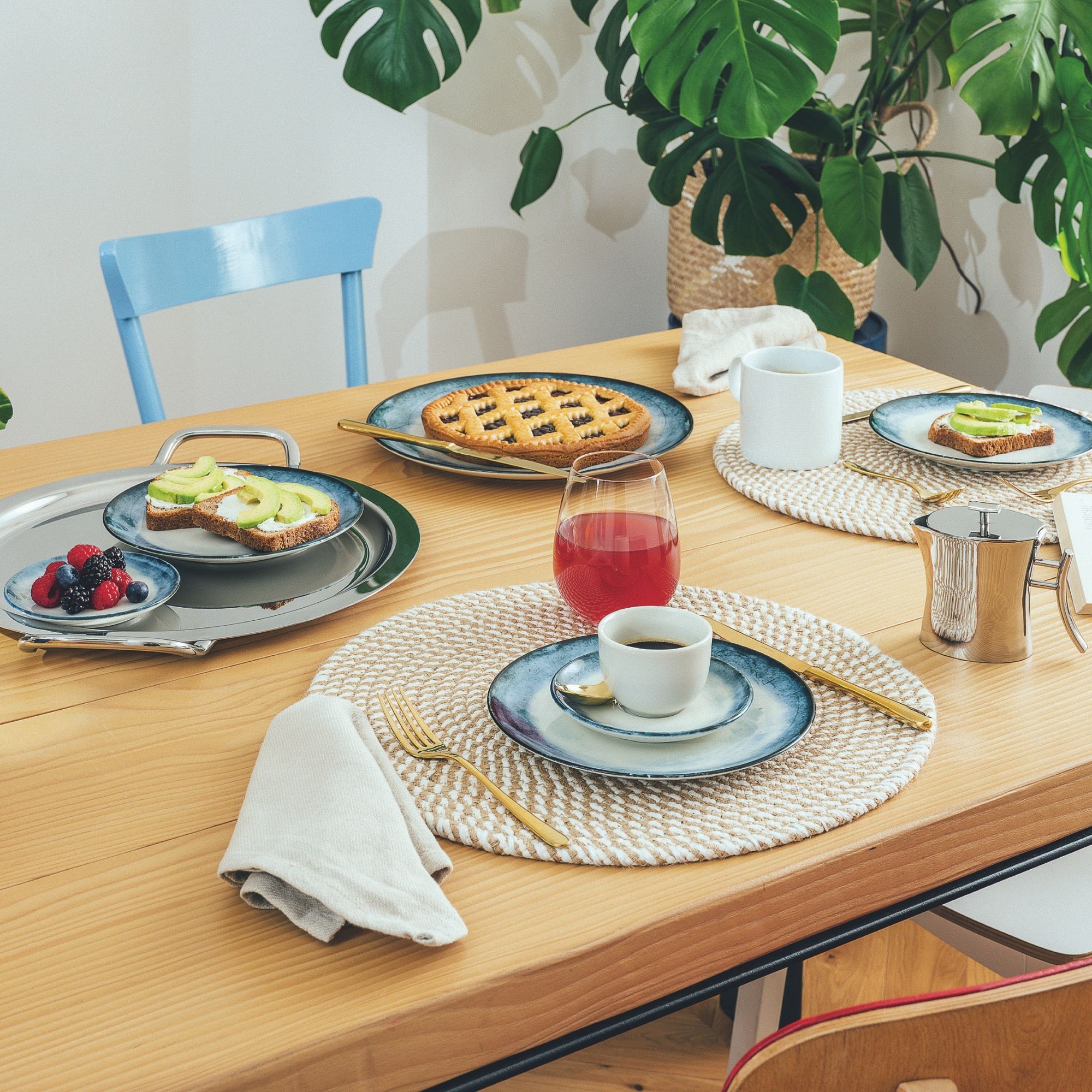 Set di 4 piatti piani dal diametro di 20 cm, appartenenti alla collezione Shade Sea, realizzati in fine porcellana decorata. Ogni piatto è caratterizzato da sfumature di tendenza, l'azzurro del bordo crea un fantastico contrasto con il bianco, generando un piacevole effetto ottico, volutamente impreciso. Perfetti per location outdoor o casual-chic, i piatti Shade Sea offrono alla tua tavola stile, qualità ed eleganza senza tempo. Questi piatti sono lavabili in lavastoviglie. Realizzati da Arthur Krupp.