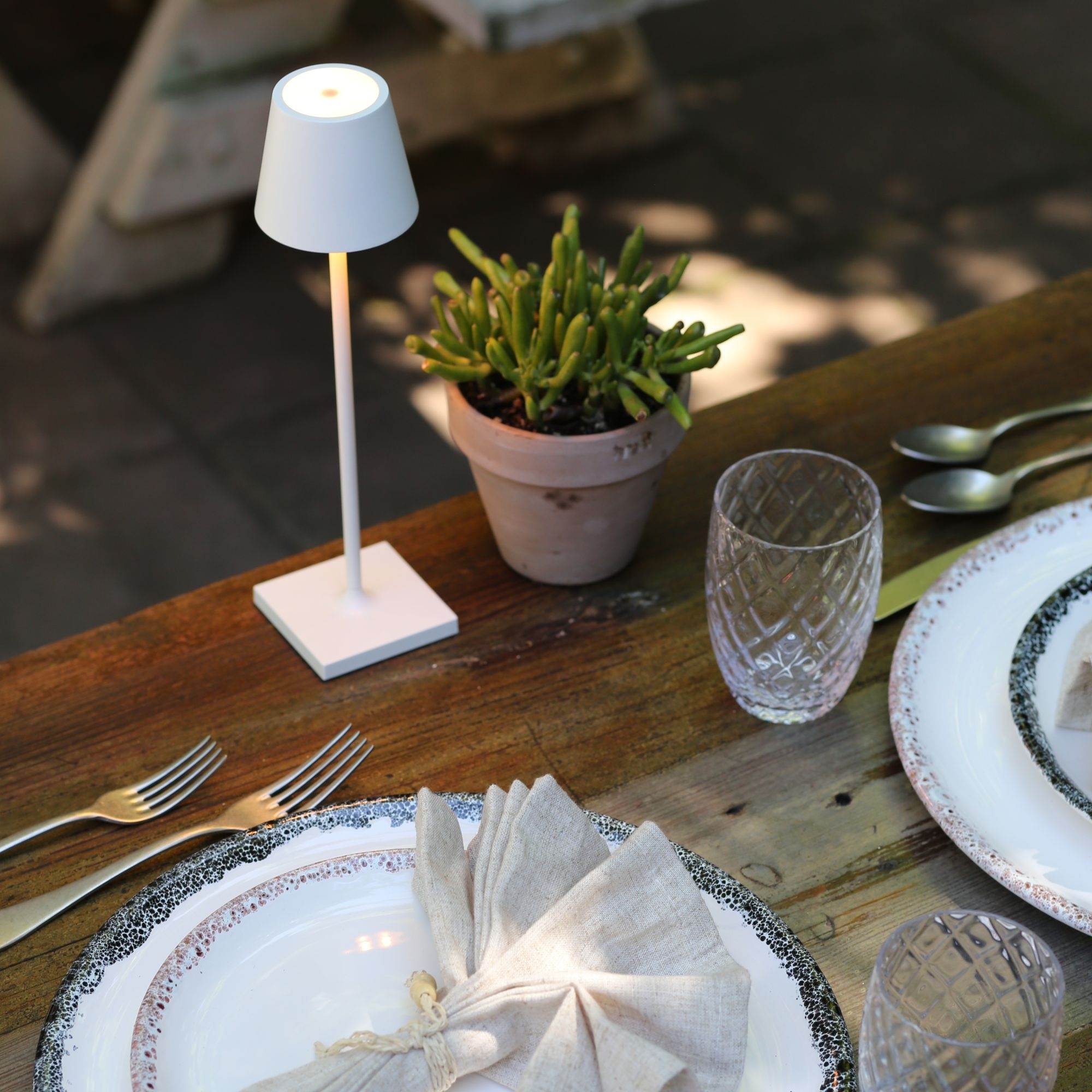 Lampada da tavolo ricaricabile Poldina Pro Micro, realizzata con corpo in alluminio verniciato e diffusore in policarbonato. Disponibile in ben 14 finiture di colore, Poldina Pro Micro si appresta ad illuminare con stile qualsiasi ambiente. E' una versione "ridotta" rispetto all'iconica lampada Zafferano, il design, invece rimane invariato. Le dimensioni ridotte la rendono perfetta per i piccoli spazi e si sposta agilmente! Dispone di una batteria ricaricabile e di una sorgente a LED che si accende e si spegne tramite l'apposito pulsante touch posto sulla sommità del diffusore. Durata batteria garantita per oltre 7 ore. Grado di protezione IP65 (uso interno ed esterno). Base di ricarica in dotazione. Realizzata da Zafferano.