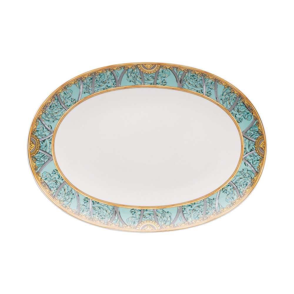 Piatto ovale 33x24 cm, appartenente alla collezione Scala del Palazzo, realizzato in finissima porcellana decorata. Ideale nelle nelle occasioni speciali, il piatto ovale Scala del Palazzo si presenta con un look davvero esclusivo. Il bordo è arricchito con eleganti motivi in stile barocco, messi in evidenza dai dettagli in oro e dal delicato sfondo color verde chiaro. Realizzato da Versace Rosenthal.