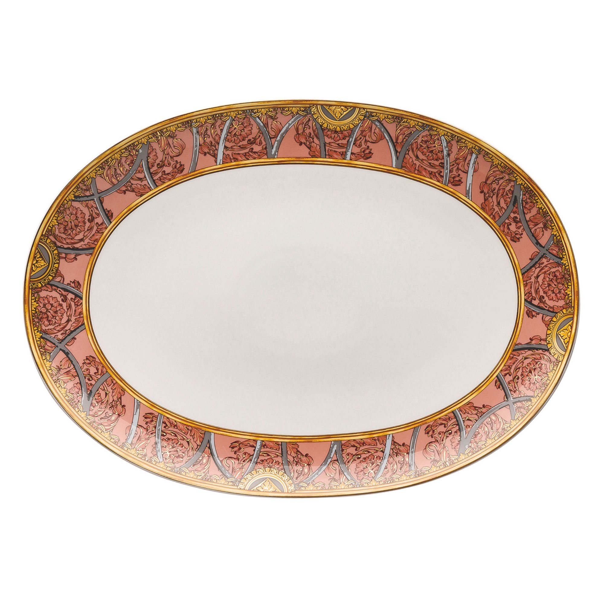 Piatto ovale 38x27 cm, appartenente alla collezione Scala del Palazzo, realizzato in finissima porcellana decorata. Ideale nelle nelle occasioni speciali, il piatto ovale Scala del Palazzo si presenta con un look davvero esclusivo. Il bordo è arricchito con eleganti motivi in stile barocco, messi in evidenza dai dettagli in oro e dal delicato sfondo color rosé. Realizzato da Versace Rosenthal.