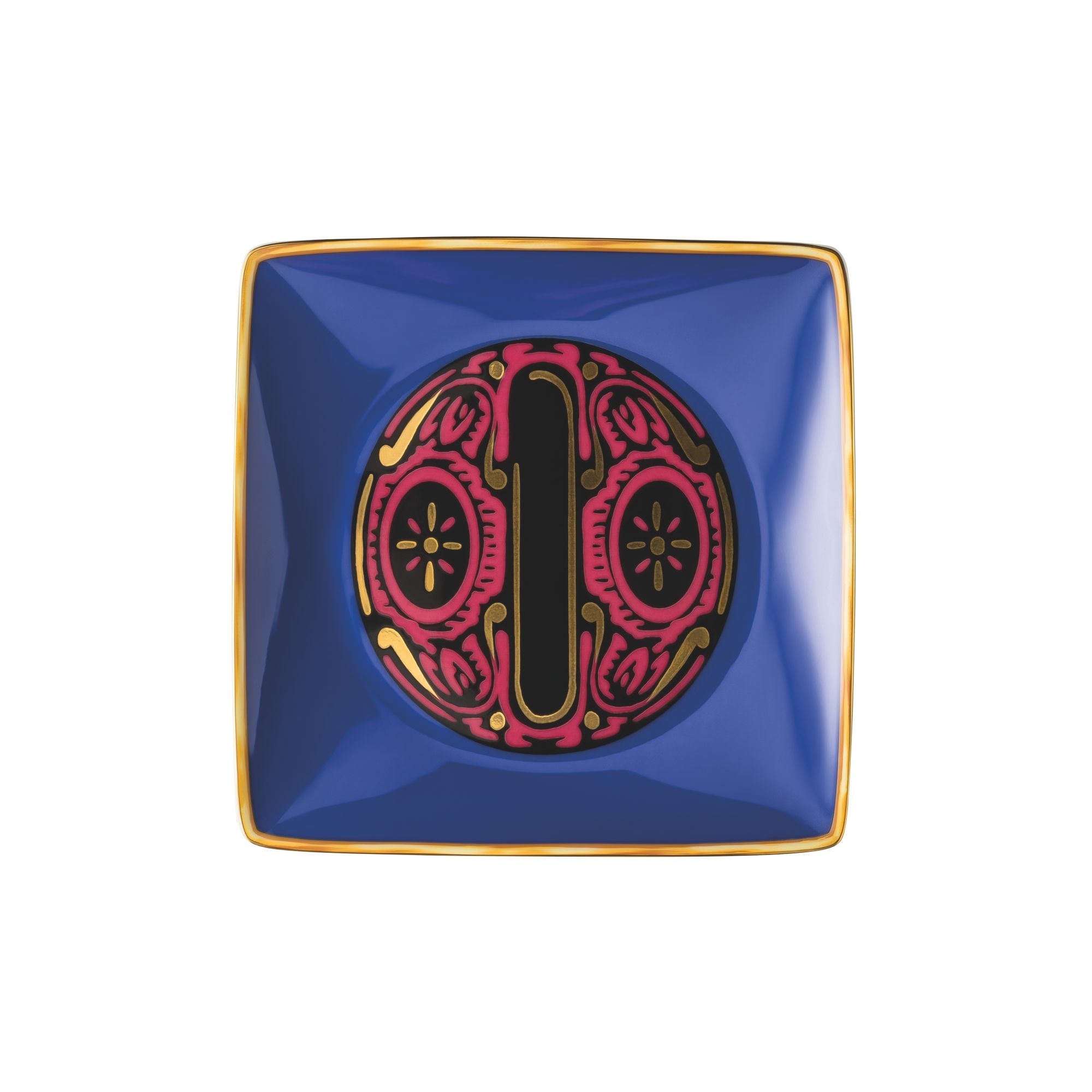 Coppetta quadra piana 12x12 cm, appartenente alla collezione Holiday Alphabet, realizzata in finissima porcellana decorata. Iconica, colorata  e decorativa, questa splendida coppetta rappresenta la lettera "O", rappresentata secondo le tecniche del lettering Barocco. Lo sfondo in blu mette in risalto il disegno e le particolarità della lettera posta al centro, donandole stile e vivacità. Realizzata da Versace Rosenthal.