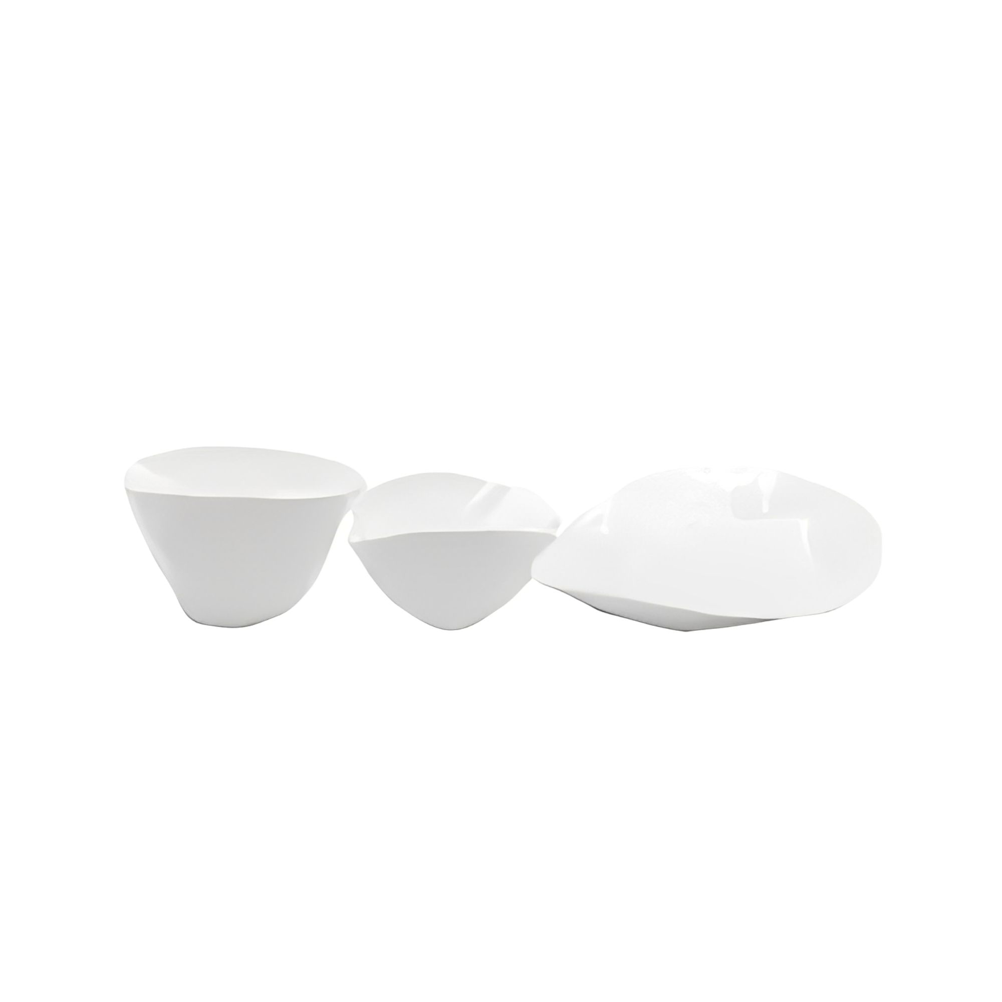 Set di 3 ciotole appartenenti alla collezione Adelaide, realizzate in porcellana Bone China. Ideali per servire insalate, salse, primi a base di brodo o gelati, le ciotole Adelaide hanno forme e dimensioni diverse tra di loro, risultando eleganti e scenografiche. La superficie lucida è di un bianco purissimo e gioca con gli effetti di movimento, creando dei pezzi unici e dalla forte valenza decorativa. Disegnate da Xie Dong per Driade.
