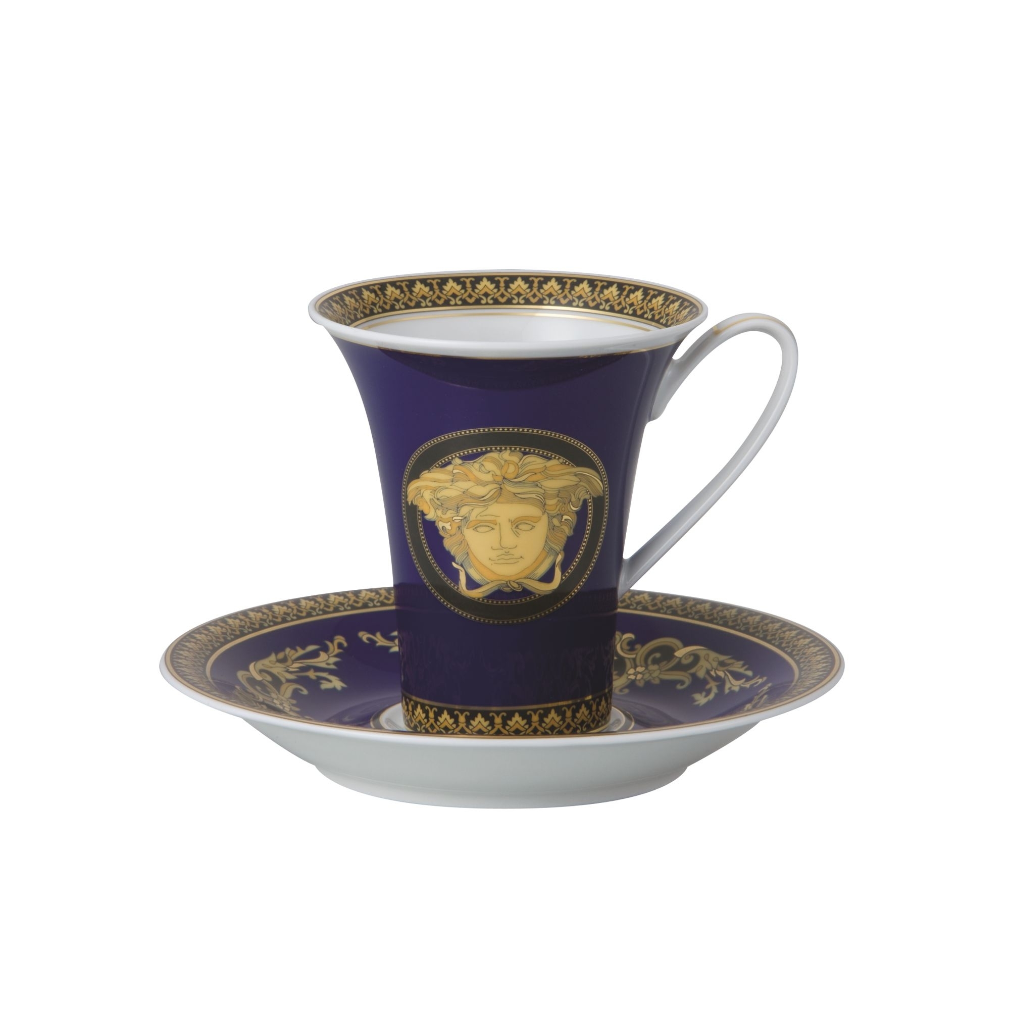 Tazza da caffè alta dalla capacità di 18 cl, appartenente alla collezione Medusa Blau, realizzata in finissima porcellana decorata. Comprensiva di piattino, la tazza da caffè Medusa Blau propone decori che raffigurano i classici elementi Versace su uno straordinario sfondo blu. Uno splendido accessorio da tavola che combina glamour e raffinatezza in modo unico. Realizzata da Versace Rosenthal.