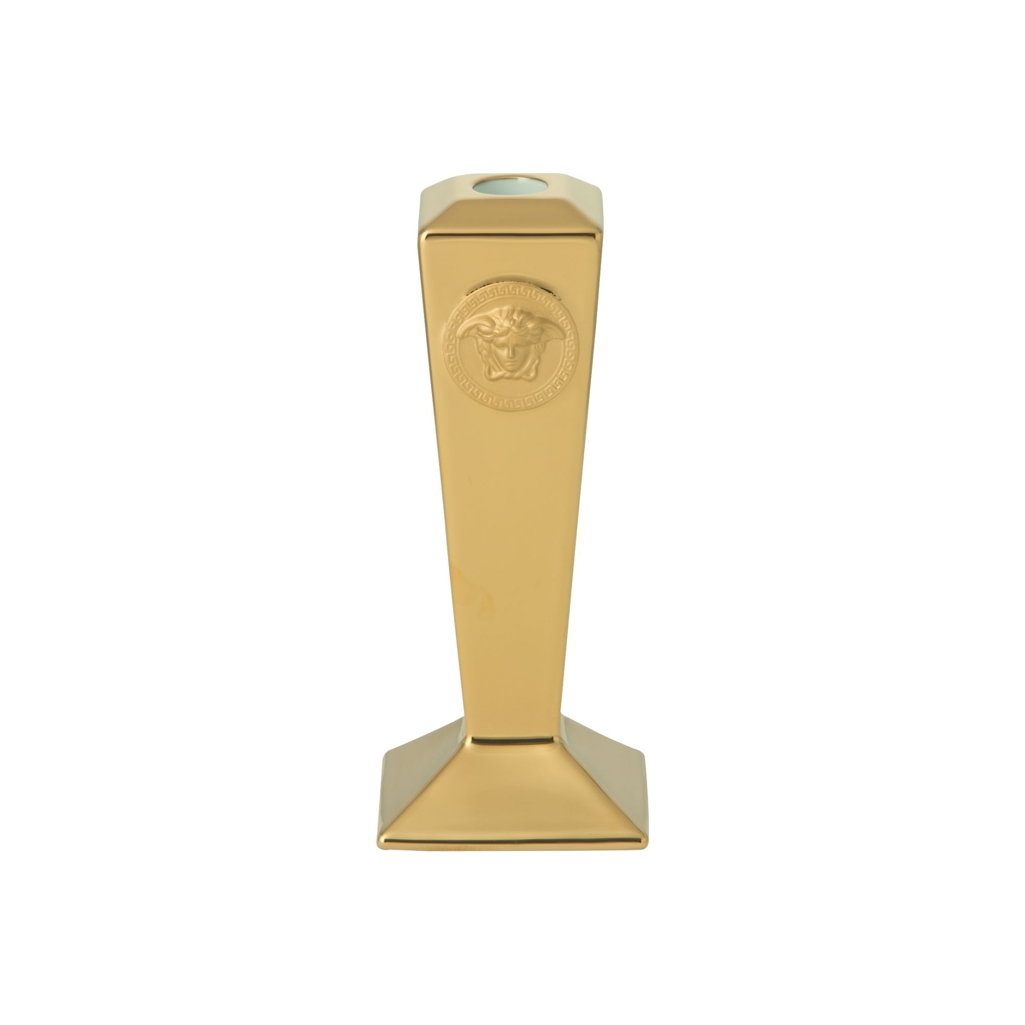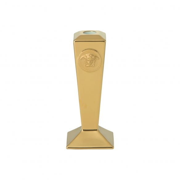 Candeliere Medusa Gold dall'altezza di 20 cm, realizzato in finissima porcellana decorata. Artistico, decorativo e iconico, il candeliere Medusa Gold si contraddistingue per la capacità di combinare un design moderno e attuale con una superba artigianalità. Gli accenti dorati esaltano l'intero pezzo e la medusa in stile Versace posizionata centralmente rende questo oggetto una vera e propria icona. Una perfetta aggiunta a qualsiasi collezione di arte classica e o antichi cimeli mitologici. Realizzato da Versace Rosenthal.