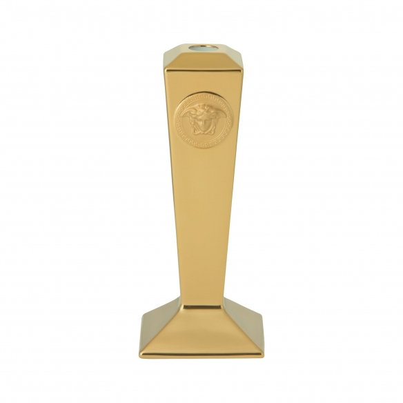 Candeliere Medusa Gold dall'altezza di 25 cm, realizzato in finissima porcellana decorata. Artistico, decorativo e iconico, il candeliere Medusa Gold si contraddistingue per la capacità di combinare un design moderno e attuale con una superba artigianalità. Gli accenti dorati esaltano l'intero pezzo e la medusa in stile Versace posizionata centralmente rende questo oggetto una vera e propria icona. Una perfetta aggiunta a qualsiasi collezione di arte classica e o antichi cimeli mitologici. Realizzato da Versace Rosenthal.