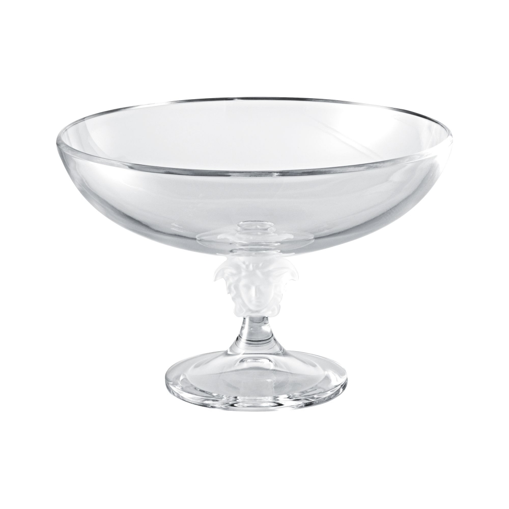 Coppa con piede della collezione Medusa Lumière, realizzata in vetro ottico. Con un diametro di 33 cm, questa splendida coppa presenta un design molto raffinato: dettagli intricati catturano l'attenzione di chiunque, rendendo questo oggetto una fantastica aggiunta a qualsiasi ambiente. Il piede è decorato una testa di Medusa di colore bianco, mentre il bordo presenta delicati dettagli color platino. Realizzata da Versace Rosenthal.