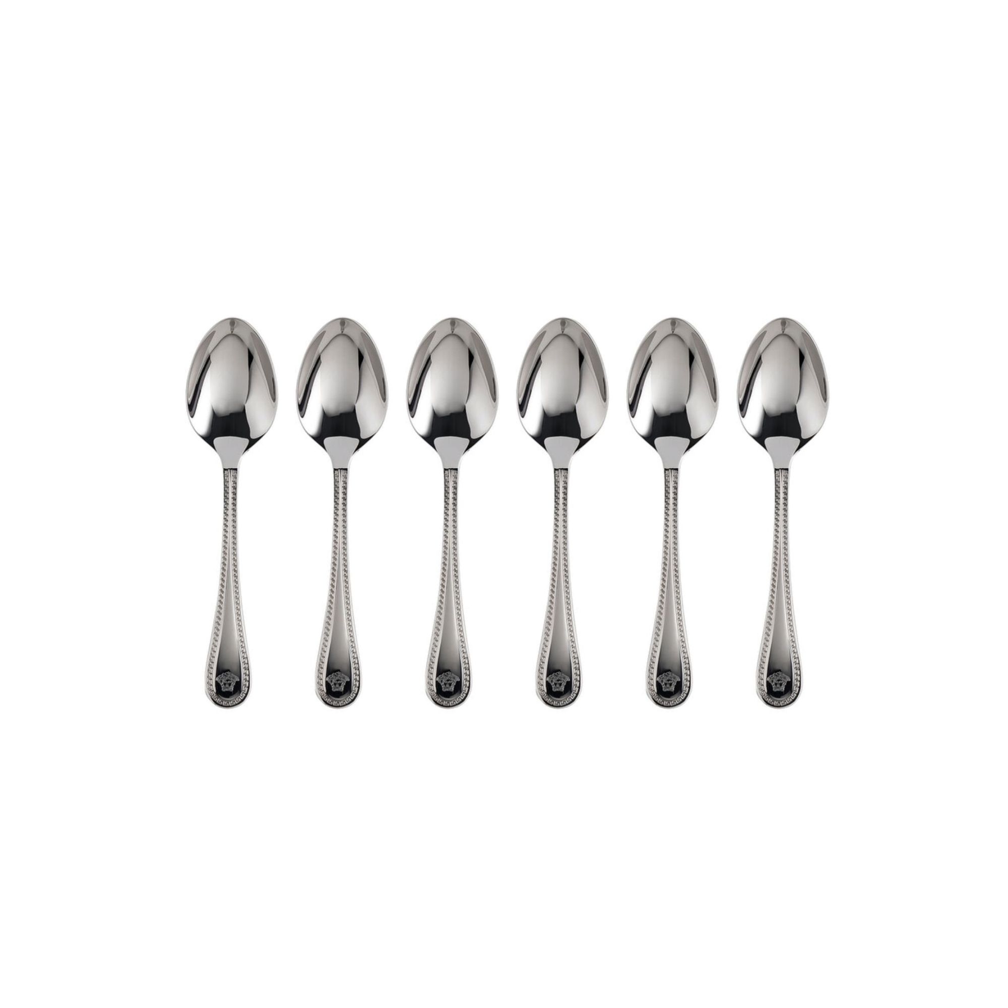 Set di 6 cucchiaini per espresso o moka, appartenenti alla collezione Greca, realizzati in acciaio inossidabile 18/10. Raffinati ed eleganti, i cucchiaini Greca renderanno i momenti di pausa caffè un vero e proprio lusso. Ogni posata è ricca di dettagli minuziosi, il manico è arricchito dal fantastico logo della testa di Medusa e la qualità dell'acciaio li rende resistenti e perfetti per l'uso quotidiano. Realizzati da Versace Rosenthal.