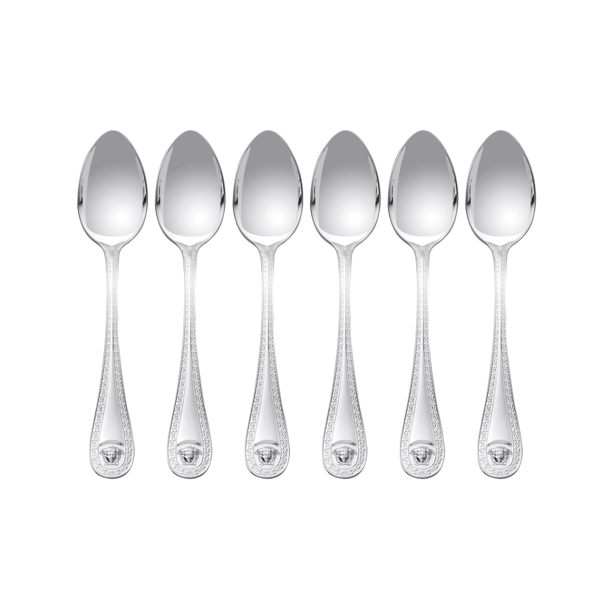 Set di 6 cucchiai da dessert, appartenenti alla collezione Medusa Versilbert, realizzati in acciaio inossidabile 18/10. Caratterizzati da un design molto elegante, i cucchiai da dessert Medusa Versilbert sono perfetti nelle cene di gala o in qualsiasi occasione speciale. Il manico di ogni posata è molto maneggevole ed è arricchito da una splendida incisione con la medusa in stile Versace. Realizzati da Versace Rosenthal.