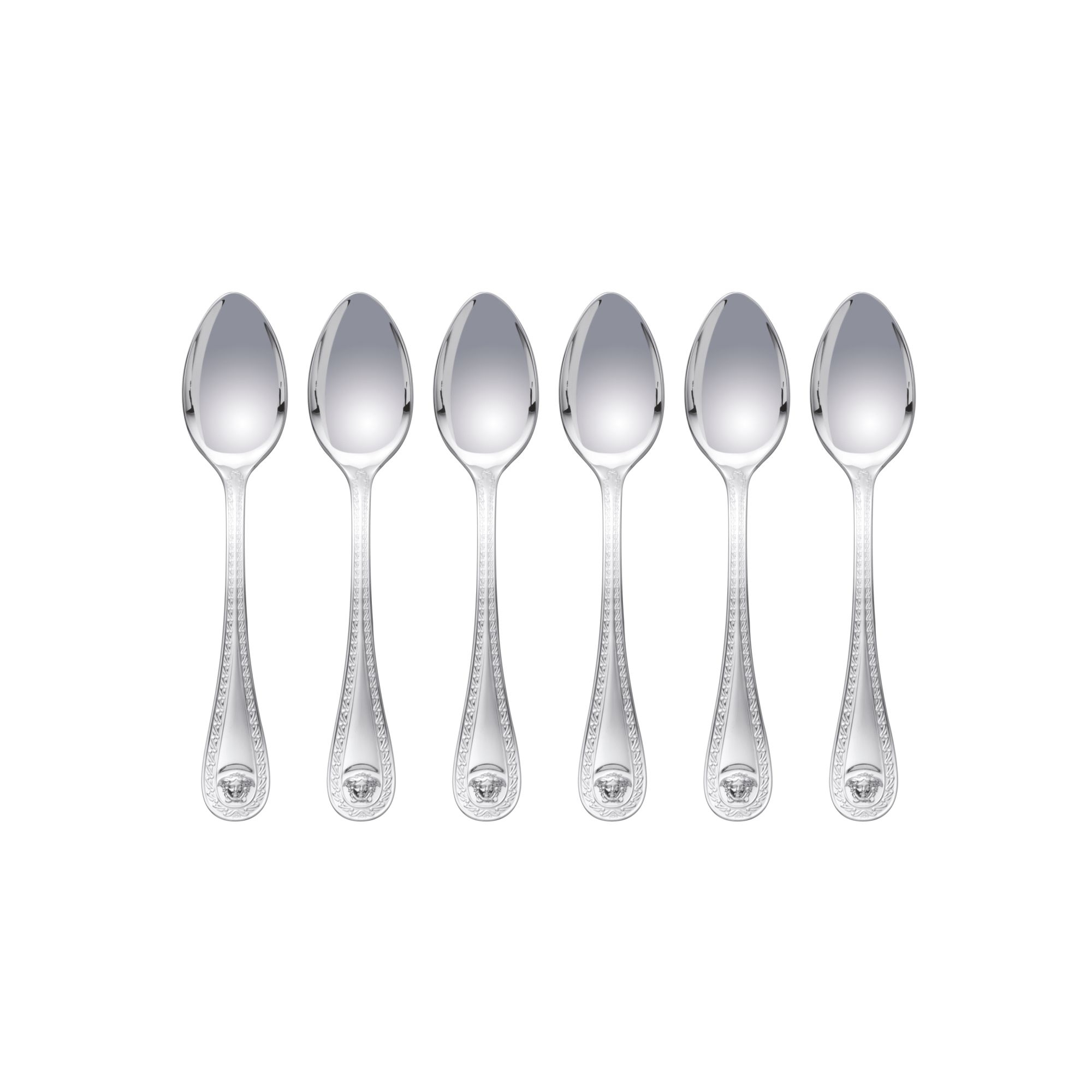Set di 6 cucchiaini da tè, appartenenti alla collezione Medusa Versilbert, realizzati in acciaio inossidabile 18/10. Con un design sofisticato, i cucchiaini Medusa Versilbert sono perfetti per le cucine dallo stile moderno. Le forme sono estremamente compatte, il design è completato con un'incisione che raffigura l'iconica medusa in stile Versace. Realizzati da Versace Rosenthal.