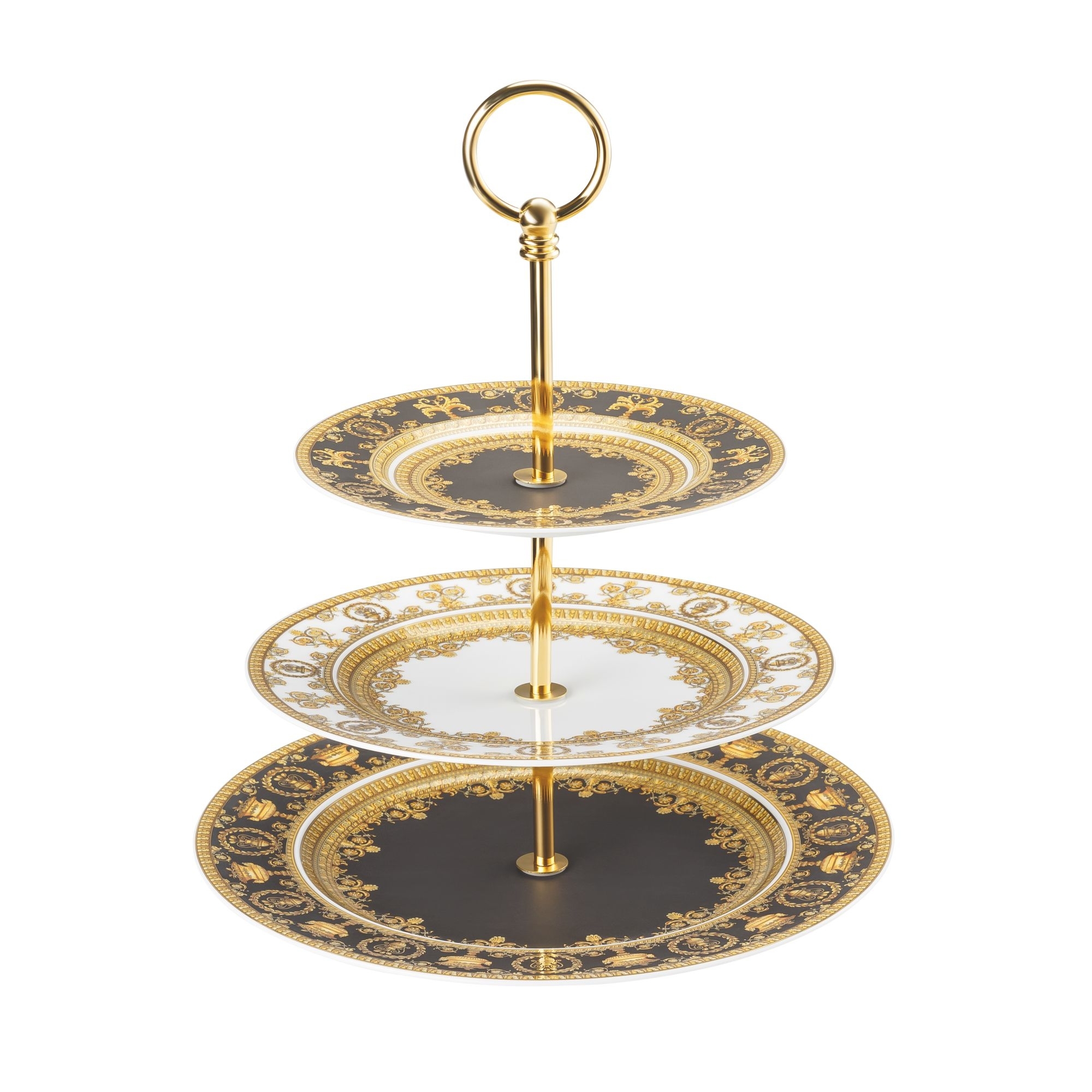 Alzata 3 pezzi appartenente alla collezione I Love Baroque, realizzata in finissima porcellana decorata. Dall'eleganza senza tempo, questo esclusivo accessorio della collezione I Love Baroque si contraddistingue per le sue trame intricate, l'esuberanza del colore oro e la raffinatezza della porcellana. I Love Baroque reinventa il quotidiano permettendoci di creare una tavola ricercata, elegante e ricca di personalità. Perfetta come idea regalo! Realizzata da Rosenthal Versace.