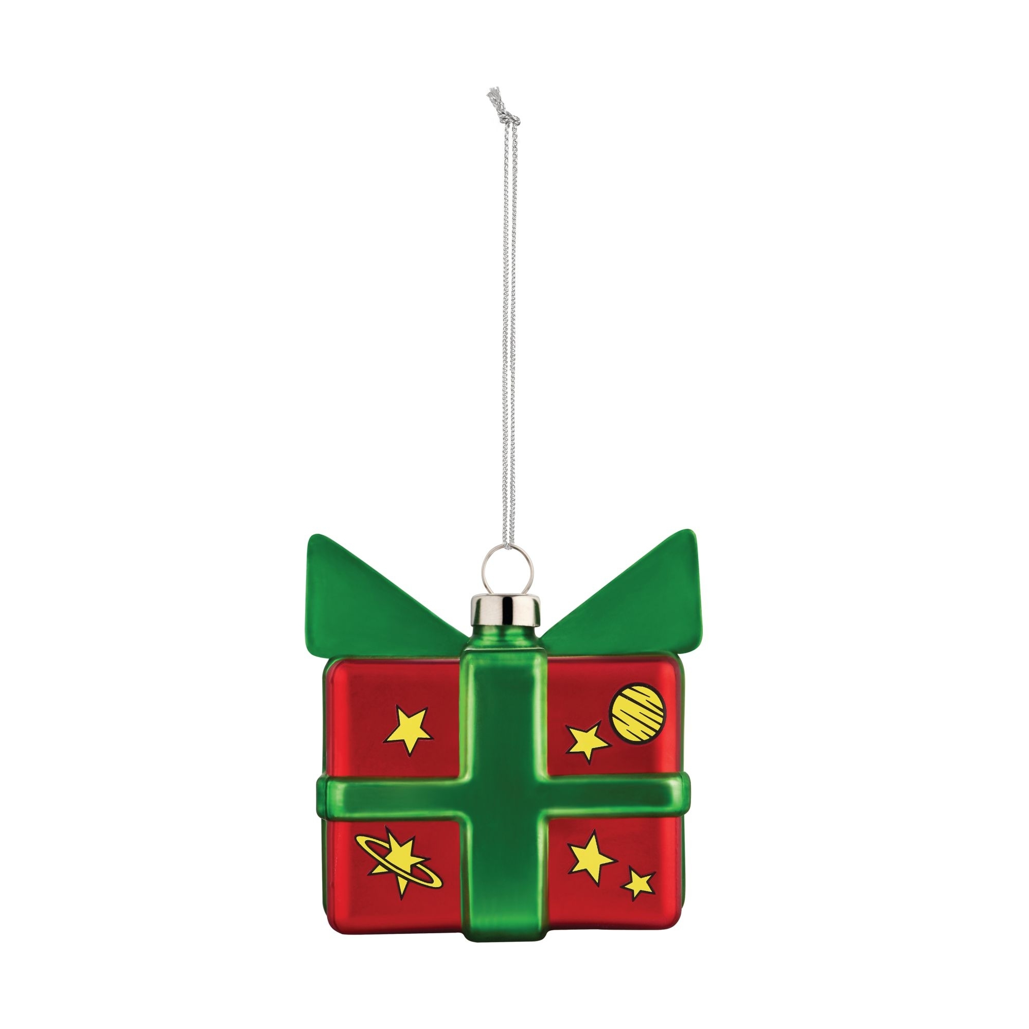 Decorazione natalizia Cobosmico, appartenente alla collezione "Le Palle Quadrate", realizzata in vetro soffiato e decorata a mano. Molto simpatica e giocosa, questa decorazione natalizia presenta una forma cubica, ed è l'ideale per abbellire l'albero in modo originale e stiloso. Raffigura un piccolo pacco regalo, simbolo storico del Natale. Disegnata da Marcello Jori e Massimo Giacon per Alessi.