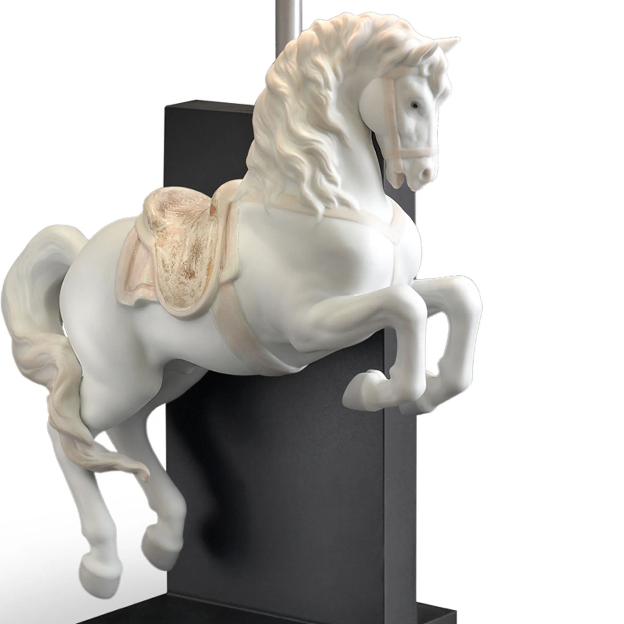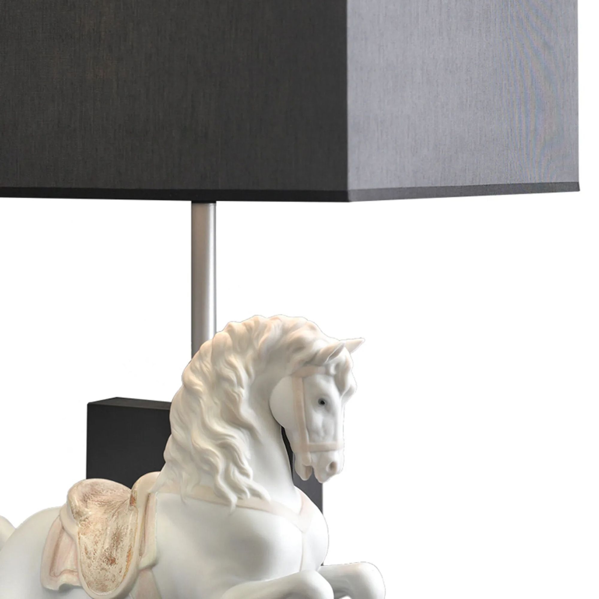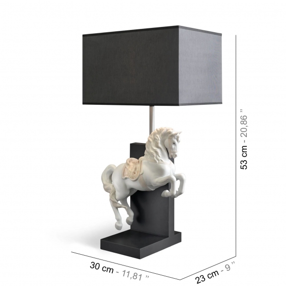 Lampada da tavolo Cavallo in Courbette, realizzata in porcellana con base in legno scuro. Cavallo in Courbette è una lampada da tavolo dall’impeccabile eleganza che celebra la bellezza della porcellana artigianale con un approccio creativo e unico. Il corpo centrale in legno scuro è impreziosito da un magnifico elemento scultoreo, simbolo di maestosità per eccellenza. Il cavallo è realizzato in porcellana bianca ed è intento in un inchino, conferendo all’oggetto un senso di intensità e dinamismo. La lampada è un piccolo capolavoro capace di affascinare al primo sguardo. Realizzata da Lladró