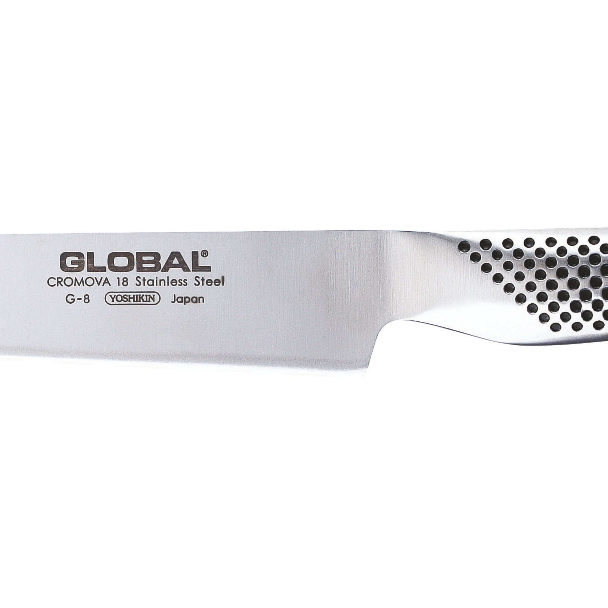 Coltello per arrosto G-08 con lama da 22 cm. Questo coltello è lo strumento perfetto per affettare il tuo arrosto domenicale o le tue carni preferite. La lama lunga e affilata è realizzata in acciaio inossidabile di alta qualità e facilita la perforazione della carne e ne consente il taglio senza che questa si rompa. Inoltre, il manico ergonomico garantisce una presa sicura, rendendolo agevolmente manovrabile mentre si taglia. Progettato da Komin Yamada