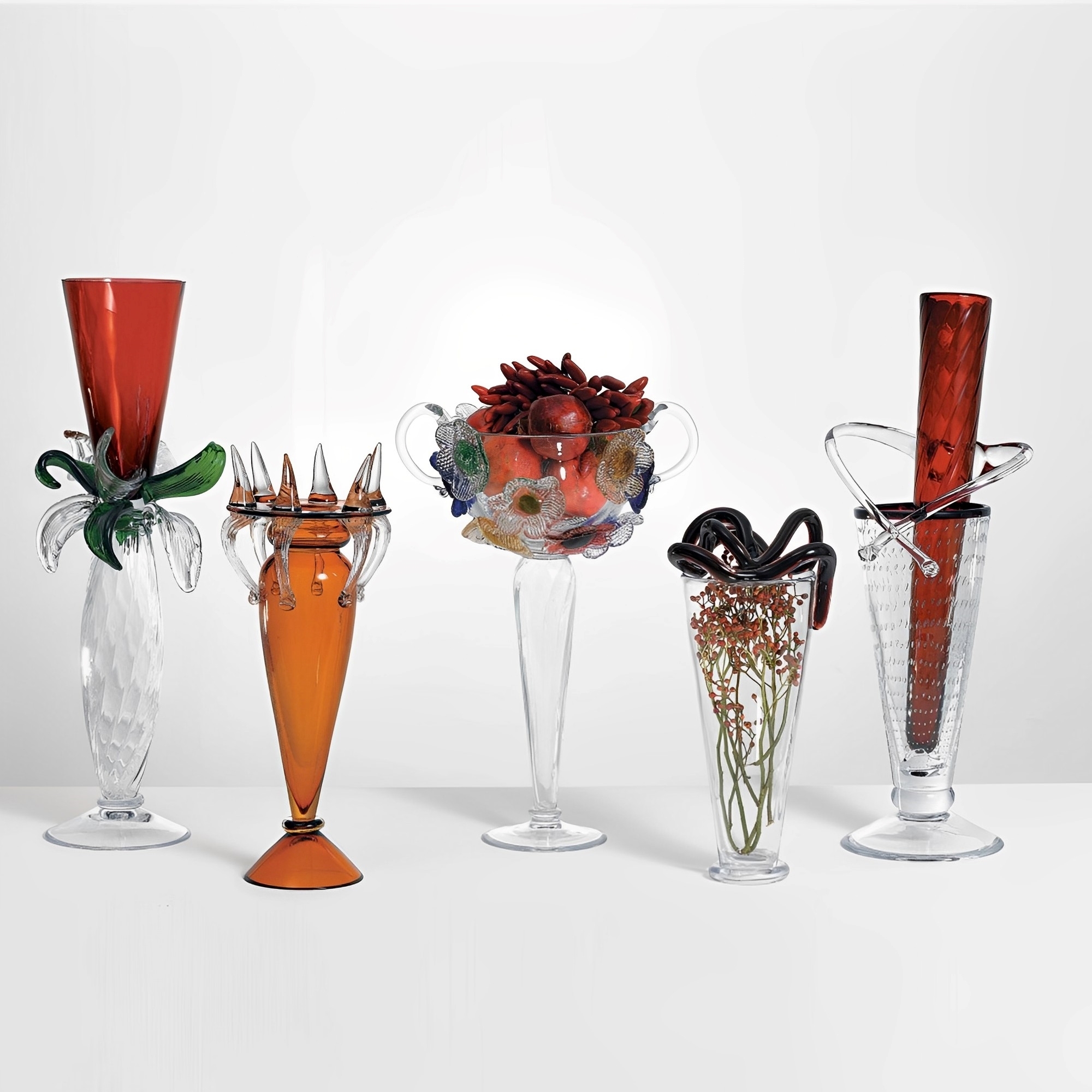 Vaso Alioscia in vetro trasparente con decoro in rosso dall'altezza di 70 cm. Elegantemente progettato, il vaso vanta un design di suggestiva originalità, frutto di una sensibilità moderna, che esplora le potenzialità del vetro con forme nuove, colori vivaci e combinazioni azzardate. È accuratamente lavorato a mano e squisitamente dettagliato; in sostanza, un connubio perfetto tra arte e fascino che si traduce in un complemento d’arredo decisamente unico e indimenticabile in grado di aggiungere un tocco di personalità e intrigo a qualsiasi spazio. Disegnato da Borek Sipek per Driade