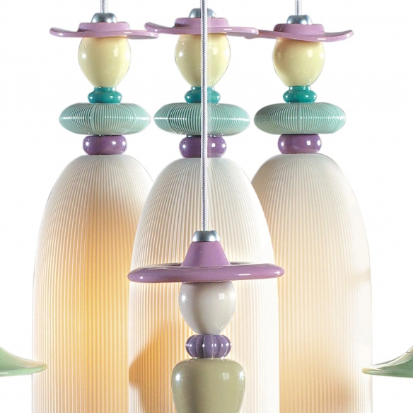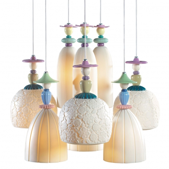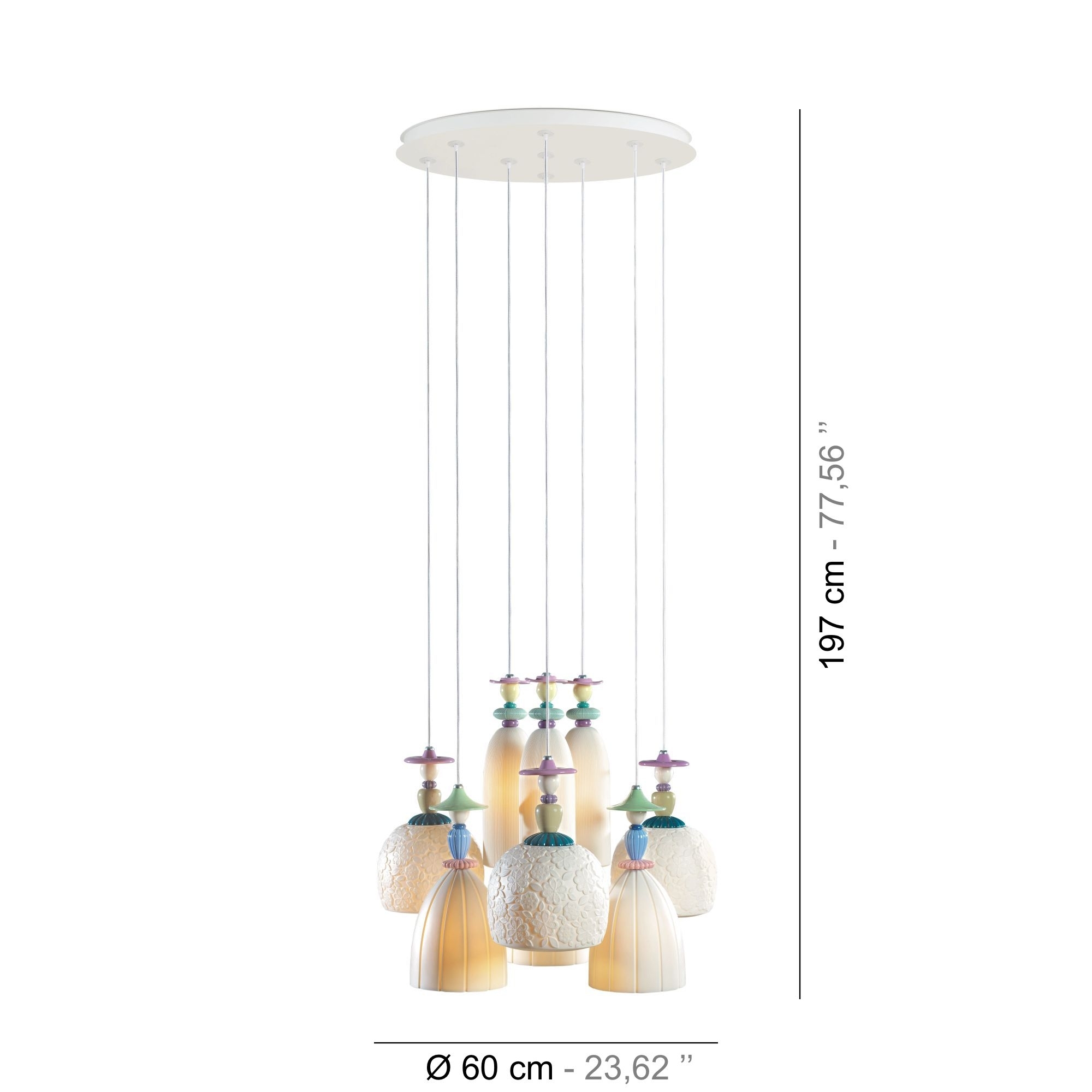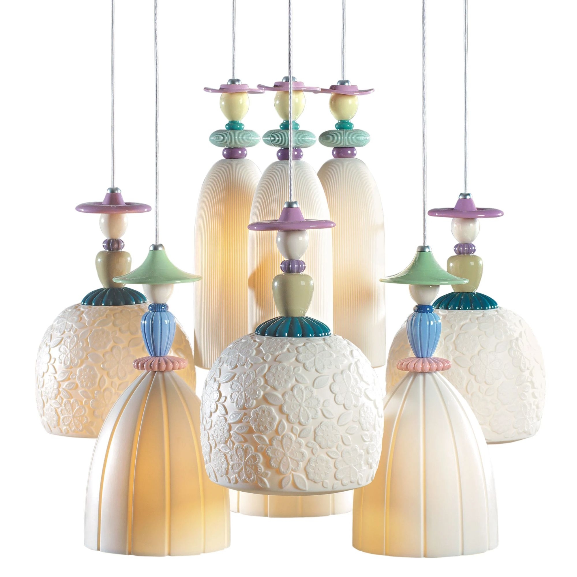Lampada a sospensione Mademoiselle Sognando di fronte al mare a 9 luci in porcellana. Mademoiselle è una lampada che cattura l’essenza di un’anima romantica e con le sue forme sinuose e delicate è capace di creare un’atmosfera sognante ed etera. Il corpo si ispira alla bellezza e al mistero della donna ed è impreziosito da dettagli che evocano femminilità e romanticismo. Mademoiselle è un complemento d’arredo decisamente unico e speciale che enfatizza la preziosità della porcellana e che ama essere ammirato. Realizzata da Lladró