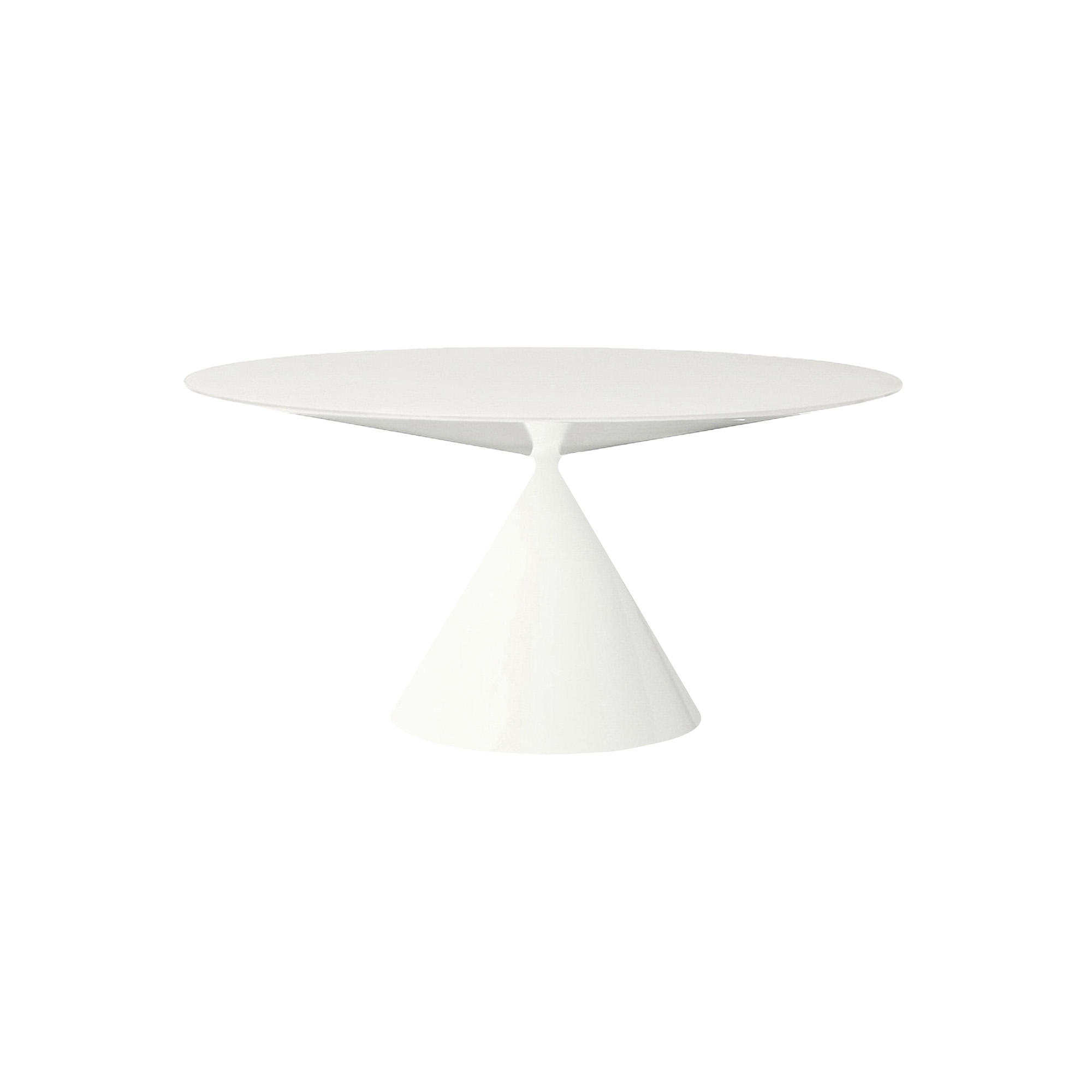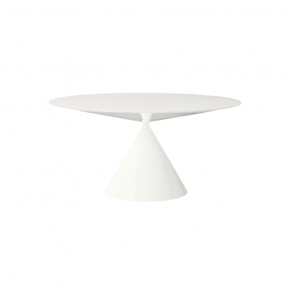 Tavolo Clay dal diametro di 180 cm. Con un profilo incredibilmente aggraziato ed elegante, il tavolo Clay è una sintesi perfetta di arditezza tecnica e invita lo spettatore ad apprezzare la perfezione delle sue forme, coniche e piene, apparentemente a mezz’aria ma armonicamente giustapposte in un punto di stabile equilibrio, creando una tensione visiva intrigante e avvincente. Clay è offerto nelle versioni indoor e outdoor con base in poliuretano rigido e piano in MDF rivestito. Disegnato da Marc Krusin