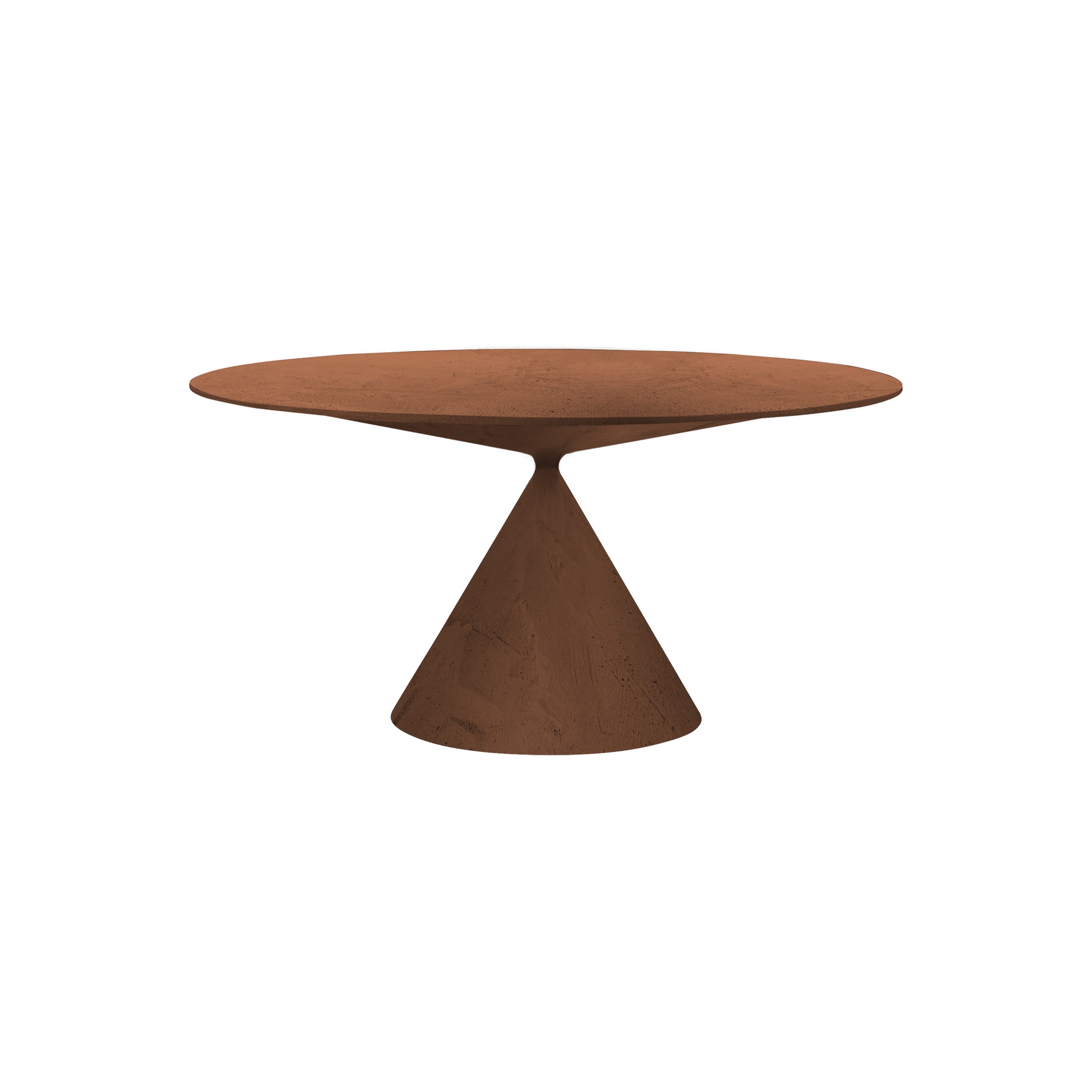 Tavolo Clay dal diametro di 180 cm. Con un profilo incredibilmente aggraziato ed elegante, il tavolo Clay è una sintesi perfetta di arditezza tecnica e invita lo spettatore ad apprezzare la perfezione delle sue forme, coniche e piene, apparentemente a mezz’aria ma armonicamente giustapposte in un punto di stabile equilibrio, creando una tensione visiva intrigante e avvincente. Clay è offerto nelle versioni indoor e outdoor con base in poliuretano rigido e piano in MDF rivestito. Disegnato da Marc Krusin