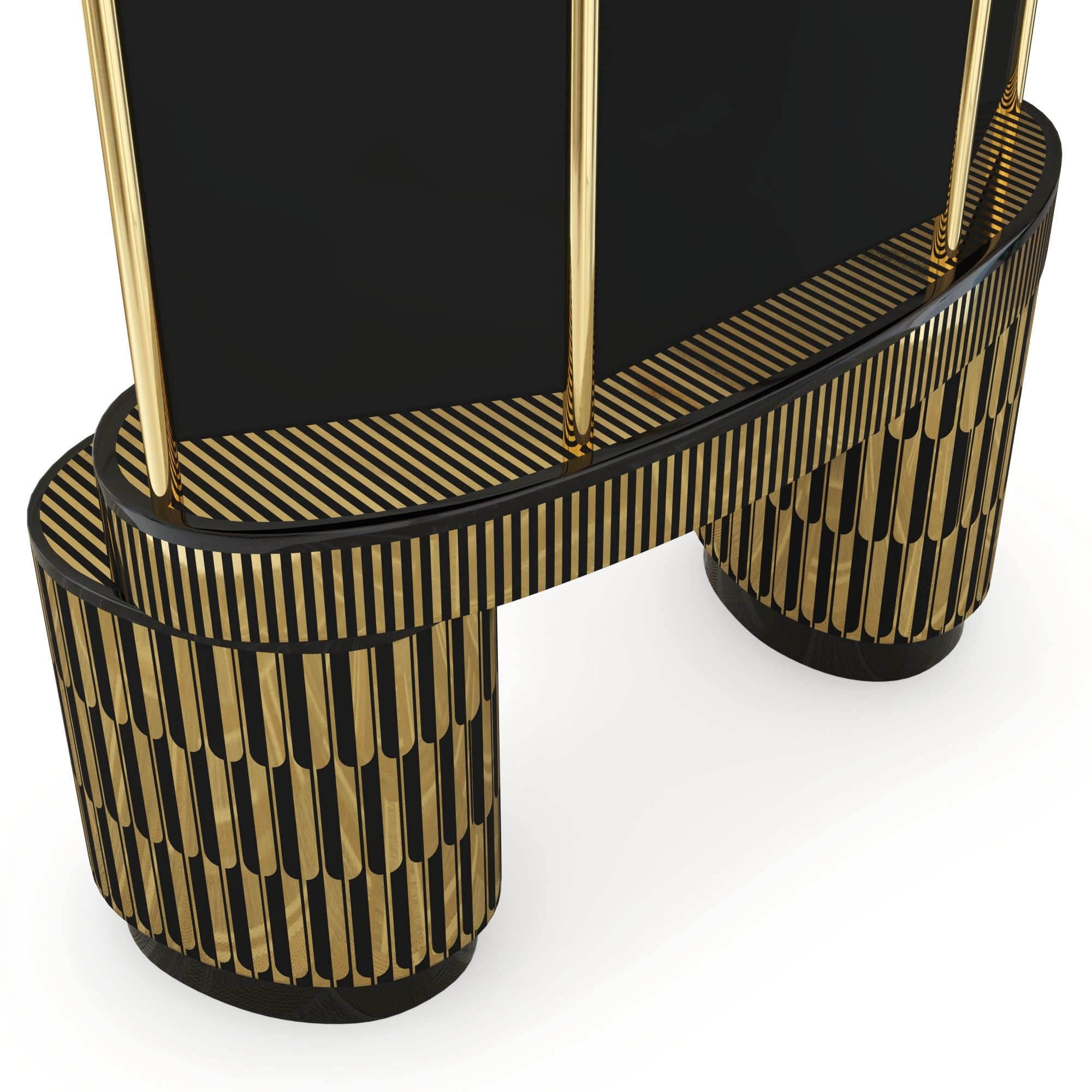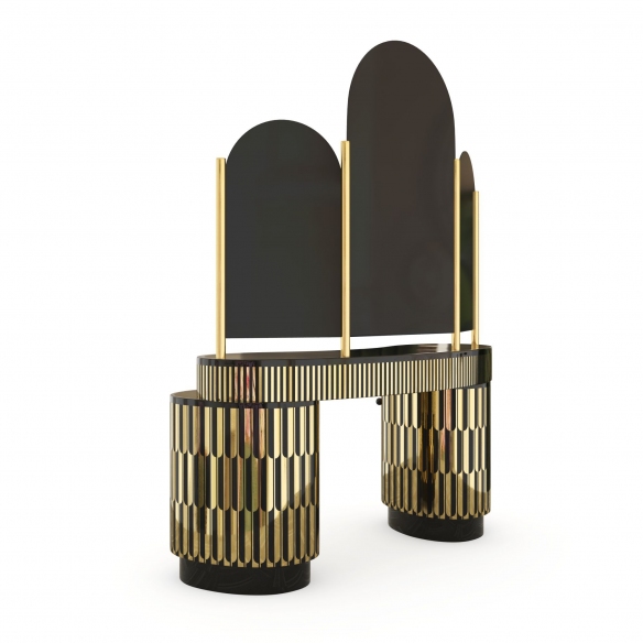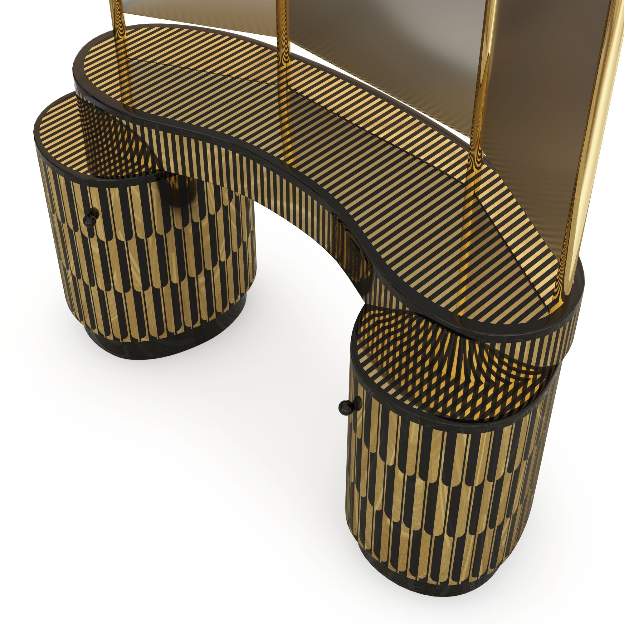 Toeletta Casablanca dall'altezza di 219 cm. Vanitosa, eccessiva e orgogliosa, questa toeletta in resina è l'epitome di raffinatezza ed eleganza, voluto e apprezzato per la sua qualità e rarità. È dotata di un ampio ripiano, cassetti per riporre gli oggetti e una finitura in resina scintillante che aggiungerà un tocco glamour a qualsiasi spazio. Si veste di un nero profondo e inchiostrato, combinato a un color vaniglia cremoso e biancastro. Casablanca è il luogo perfetto per prepararsi per la giornata! Disegnata da Matteo Cibic