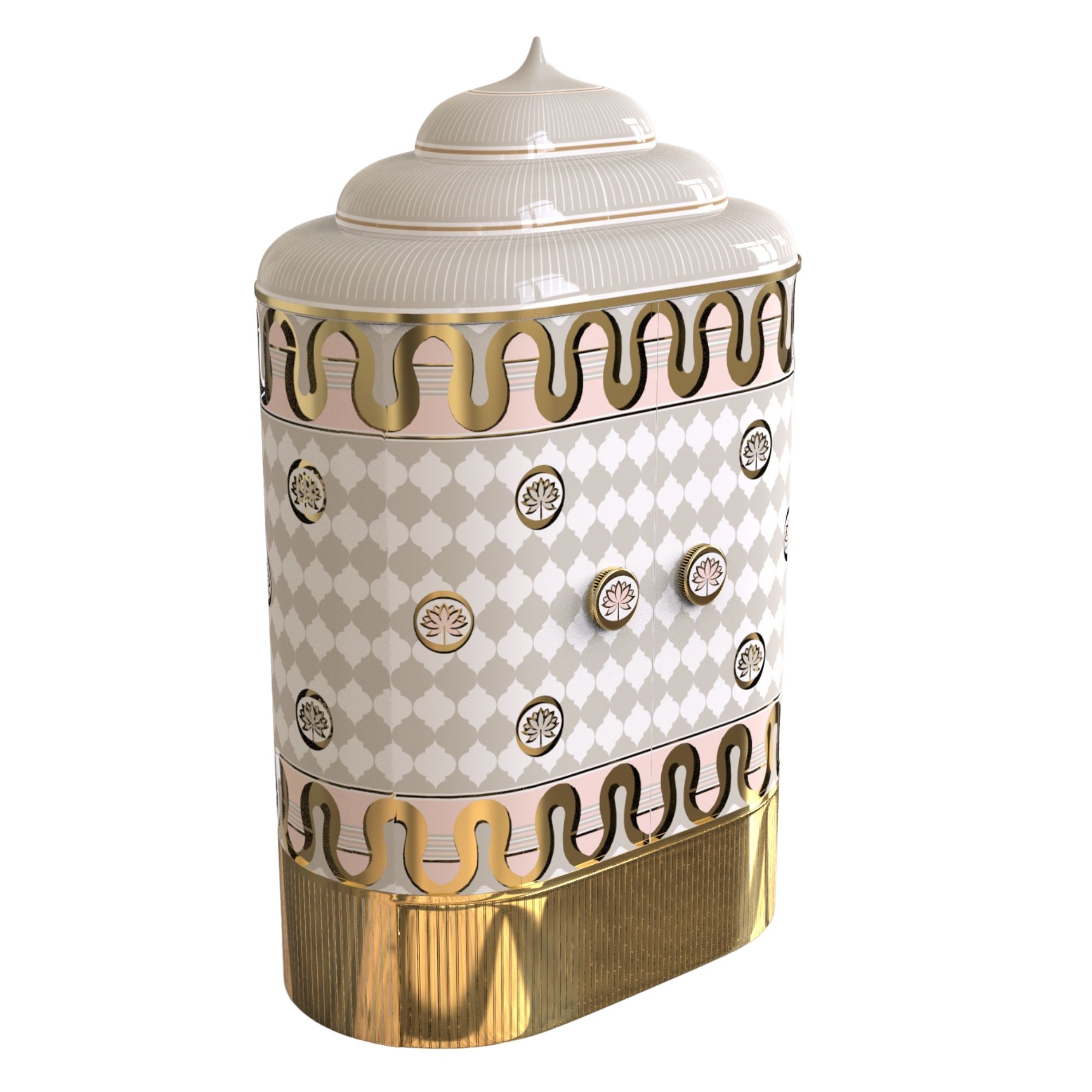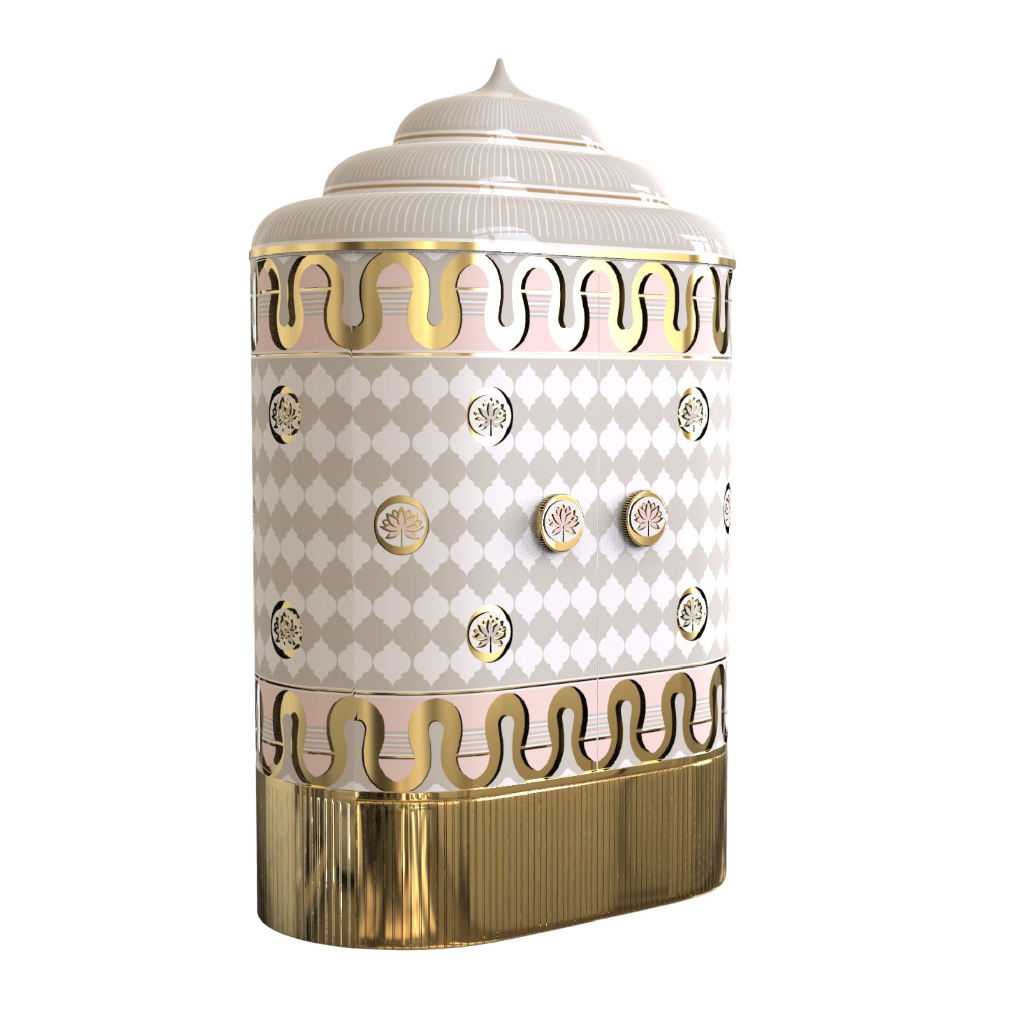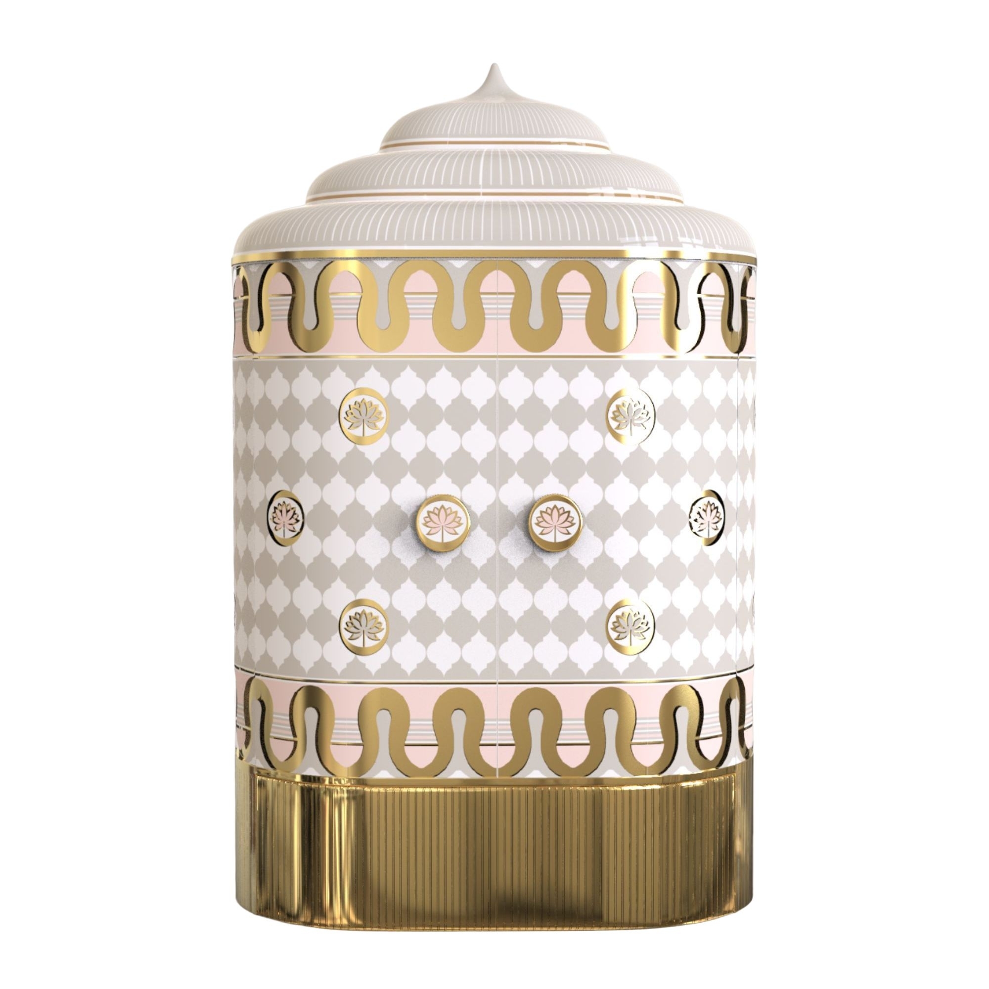 Armadio contenitore Lotus Sanctum Basra dall'altezza di 141.5 cm. Forme scultoree tridimensionali, un lavoro fatto con intelligenza, esperienza e abilità, il cabinet Lotus Sanctum Basra preferisce non conformarsi a una norma prestabilita. È un connubio di contemporaneità e tradizione che sfrutta al massimo il materiale in ottone e si veste di tonalità colorate, piene di vita e stimolanti alla vista. Mandala è un’idea insolita e disparata per aprirsi a nuove e lussuose esperienze di arredamento. Disegnato da Matteo Cibic