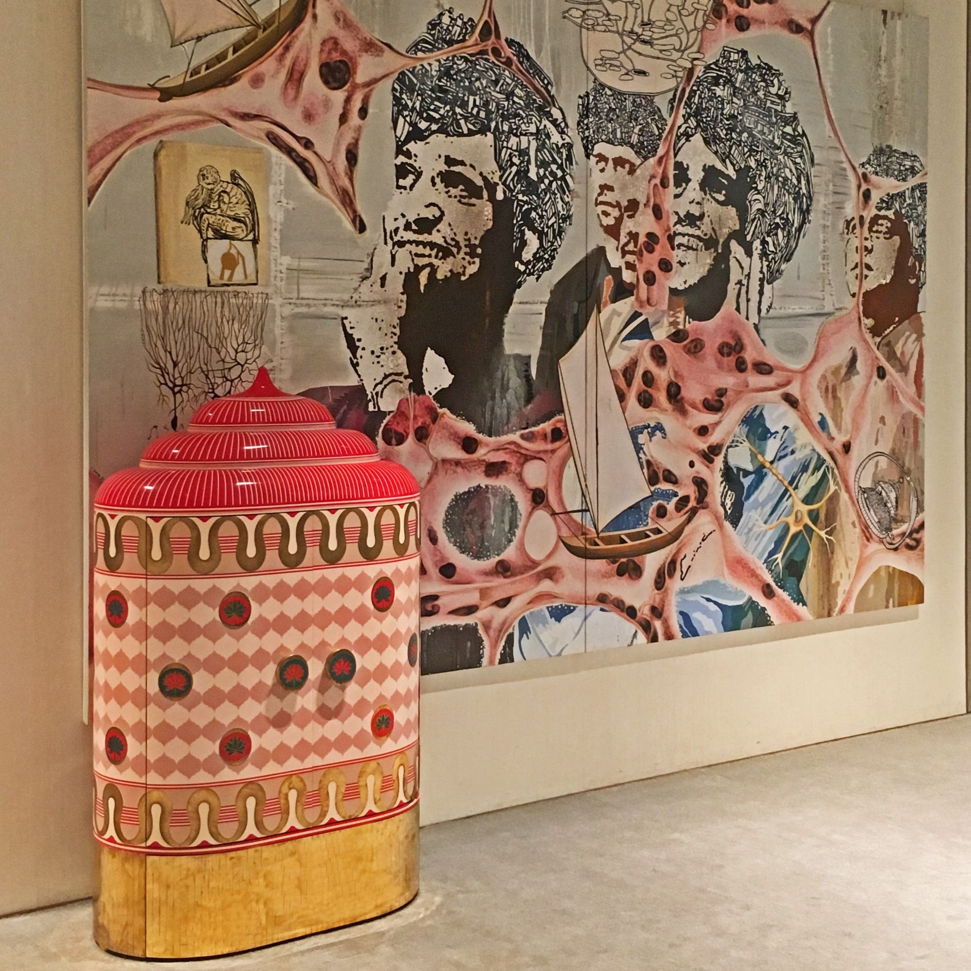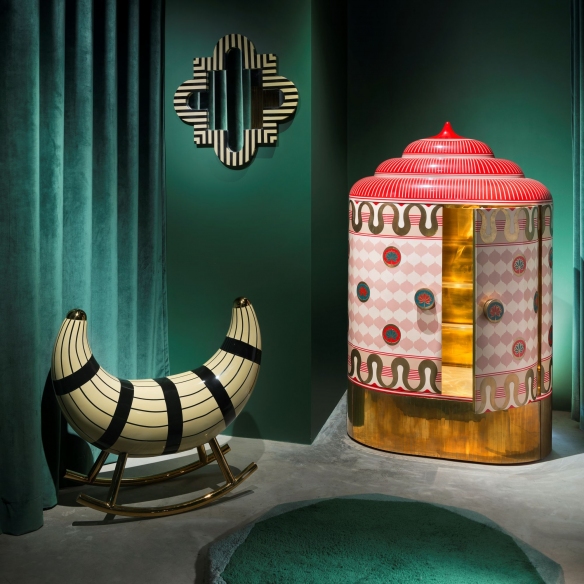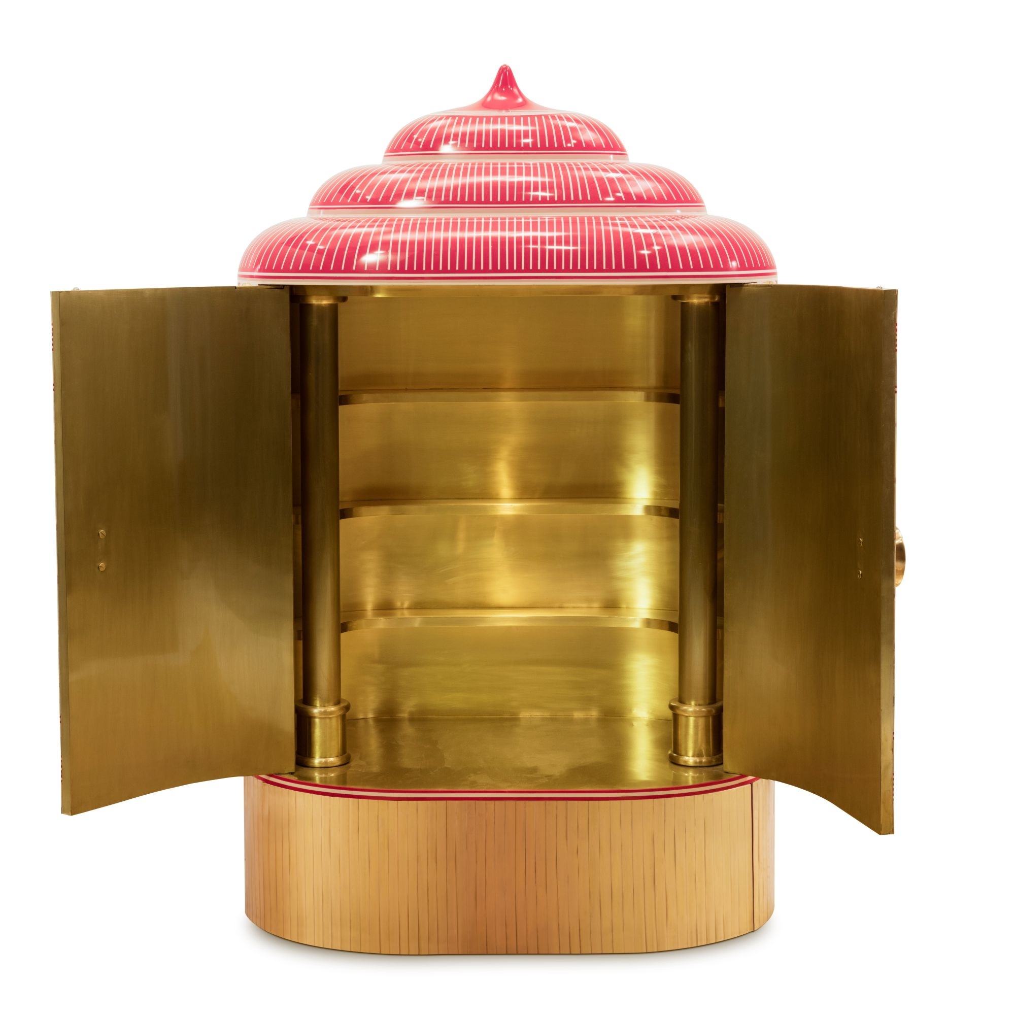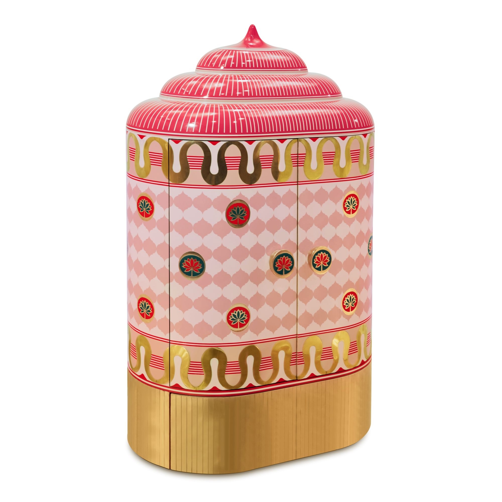 Armadio contenitore Lotus Sanctum dall'altezza di 141.5 cm. Forme scultoree tridimensionali, un lavoro fatto con intelligenza, esperienza e abilità, il cabinet Lotus Sanctum preferisce non conformarsi a una norma prestabilita. È un connubio di contemporaneità e tradizione che sfrutta al massimo il materiale in ottone e si veste di tonalità colorate, piene di vita e stimolanti alla vista. Mandala è un’idea insolita e disparata per aprirsi a nuove e lussuose esperienze di arredamento. Disegnato da Matteo Cibic