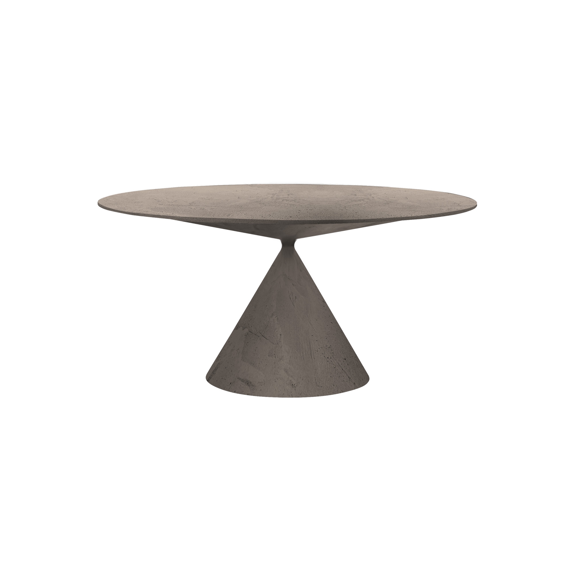 Tavolo Clay dal diametro di 180 cm. Con un profilo incredibilmente aggraziato ed elegante, il tavolo Clay è una sintesi perfetta di arditezza tecnica e invita lo spettatore ad apprezzare la perfezione delle sue forme, coniche e piene, apparentemente a mezz’aria ma armonicamente giustapposte in un punto di stabile equilibrio, creando una tensione visiva intrigante e avvincente. Clay è offerto nella versione outdoor con base in poliuretano rigido e piano in cristallo o spatolato. Disegnato da Marc Krusin