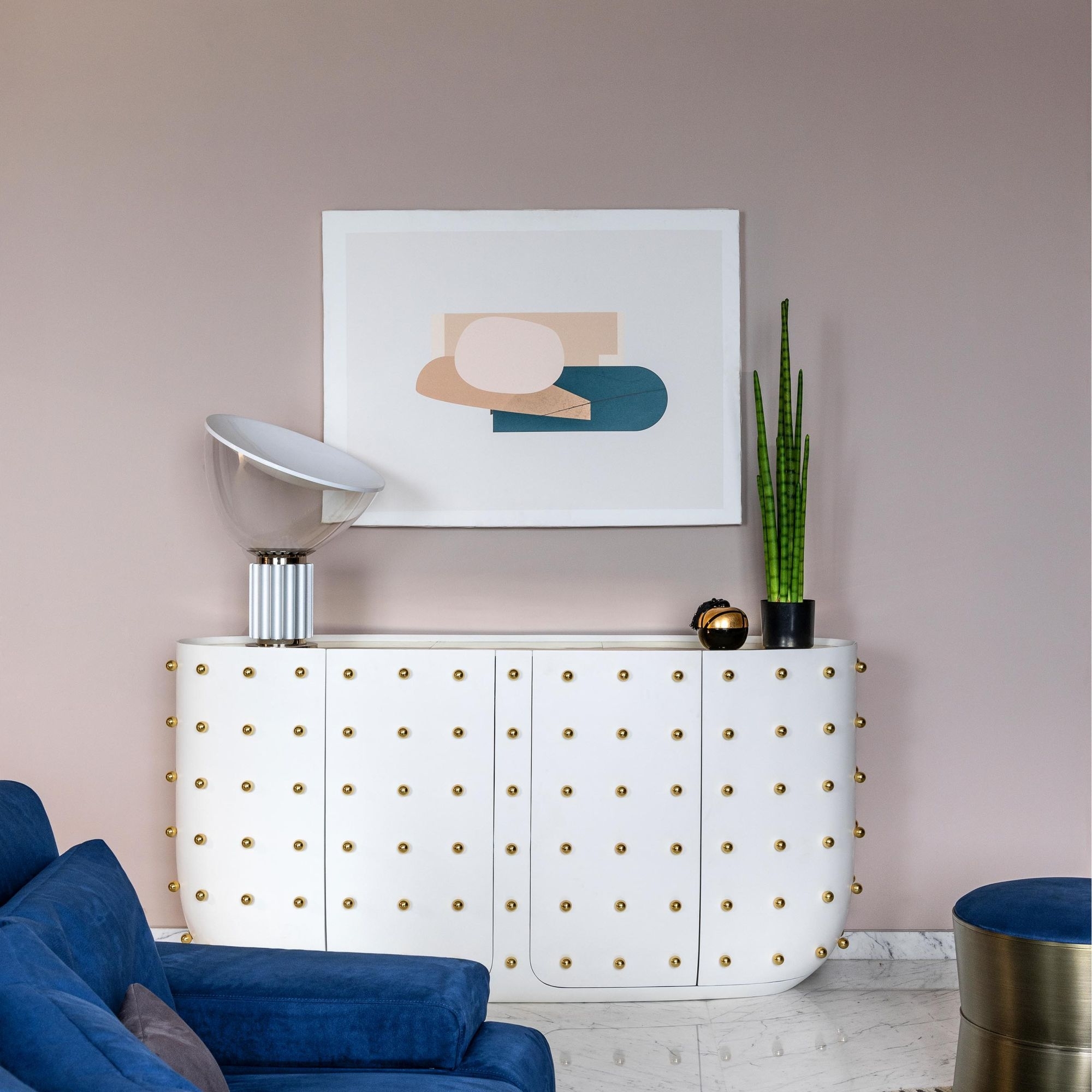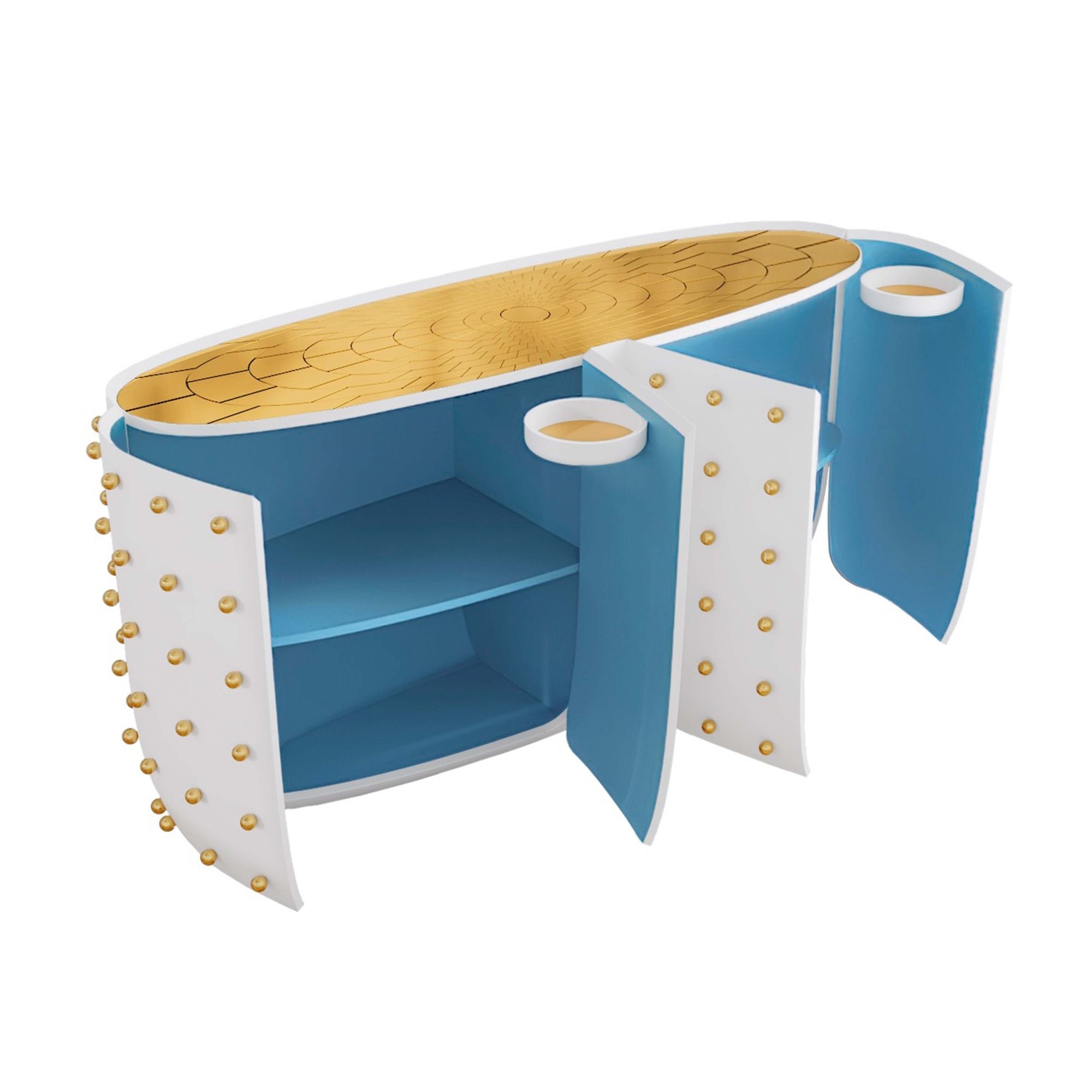 Credenza Oasis dall'altezza di 92 cm. Insolito e giocoso, questo mobile è realizzato in MDF, con piano di appoggio in ottone, e perfetto per lanciarsi in un'avventura botanica esplorando i suoi magnifici dettagli in ottone, quasi come se fluttuasse a mezz'aria. Aprendosi, Oasis svela meraviglie! Disegnata da Richard Hutten
