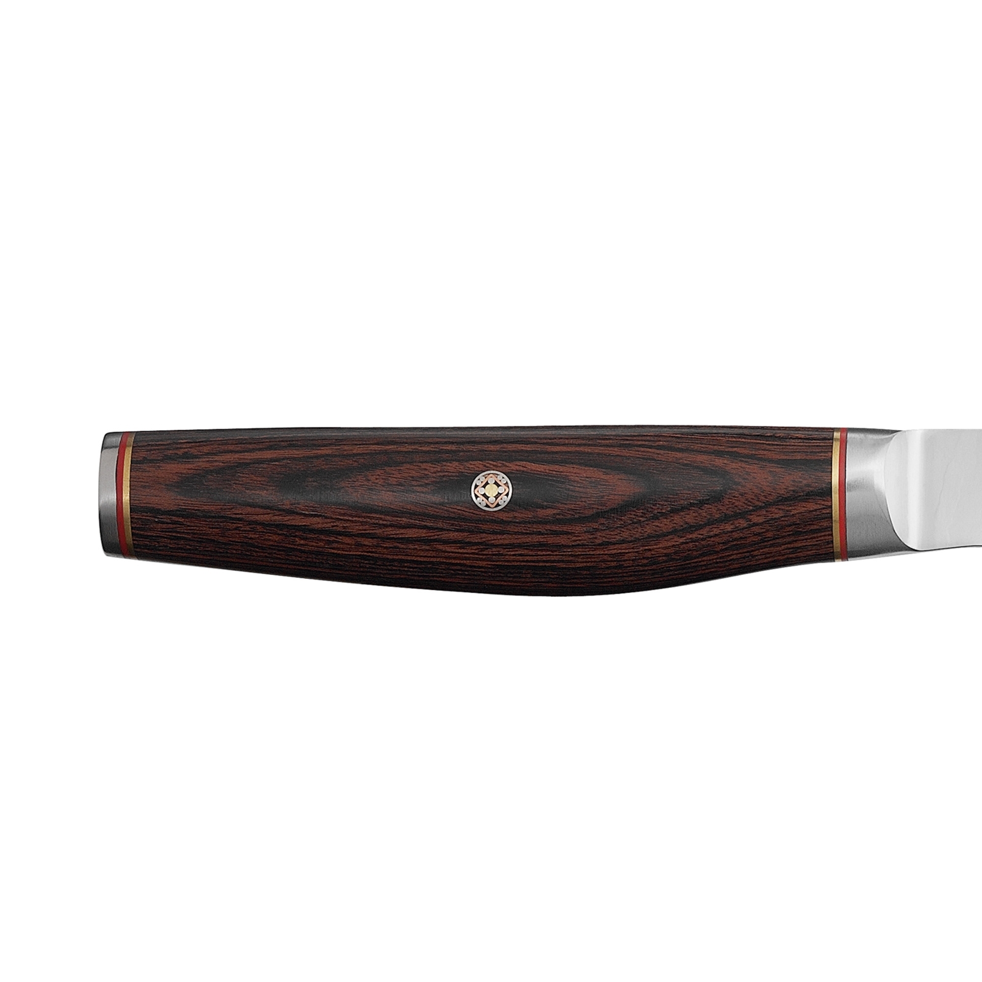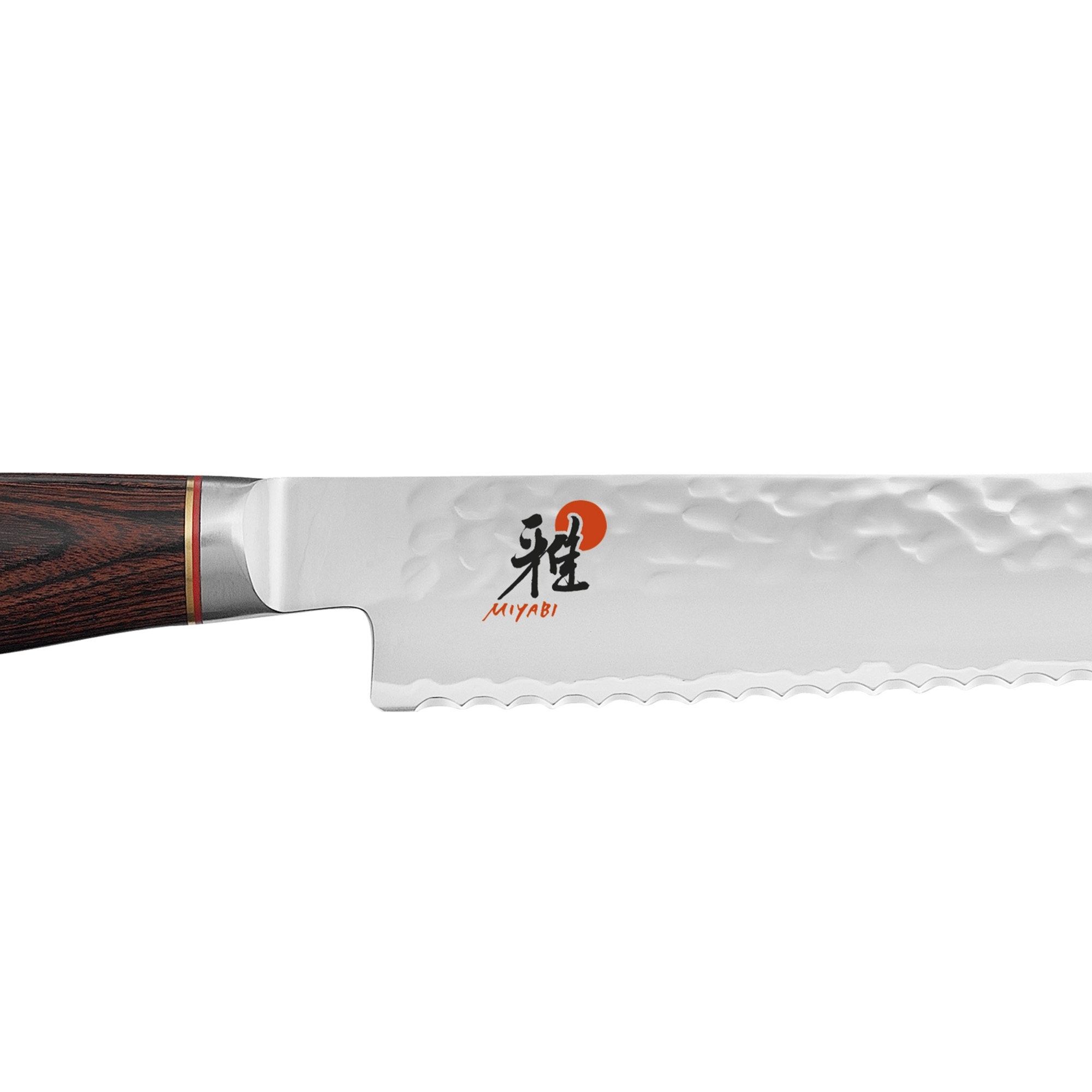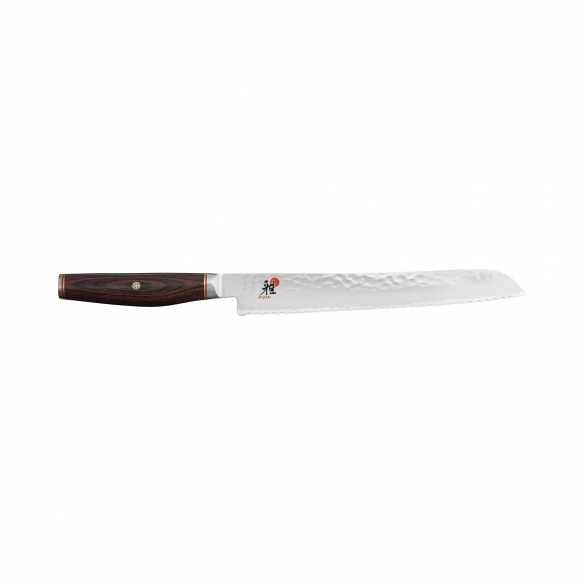 Coltello per il pane realizzato in acciaio Micro Carbide MC63, appartenente alla linea 6000 MCT. Ha una lama importante da 23 cm, resistente alla ruggine e alla corrosione, e un elegante manico in legno Cocobolo, impreziosito da scorci di scarlatto, che offre una presa comoda e sicura. Il suo bordo seghettato è ciò che lo differenzia degli altri strumenti da taglio e progettato per scivolare facilmente attraverso le croste più spesse e croccanti. È un classico che non può mancare in cucina! Fatto da Miyabi