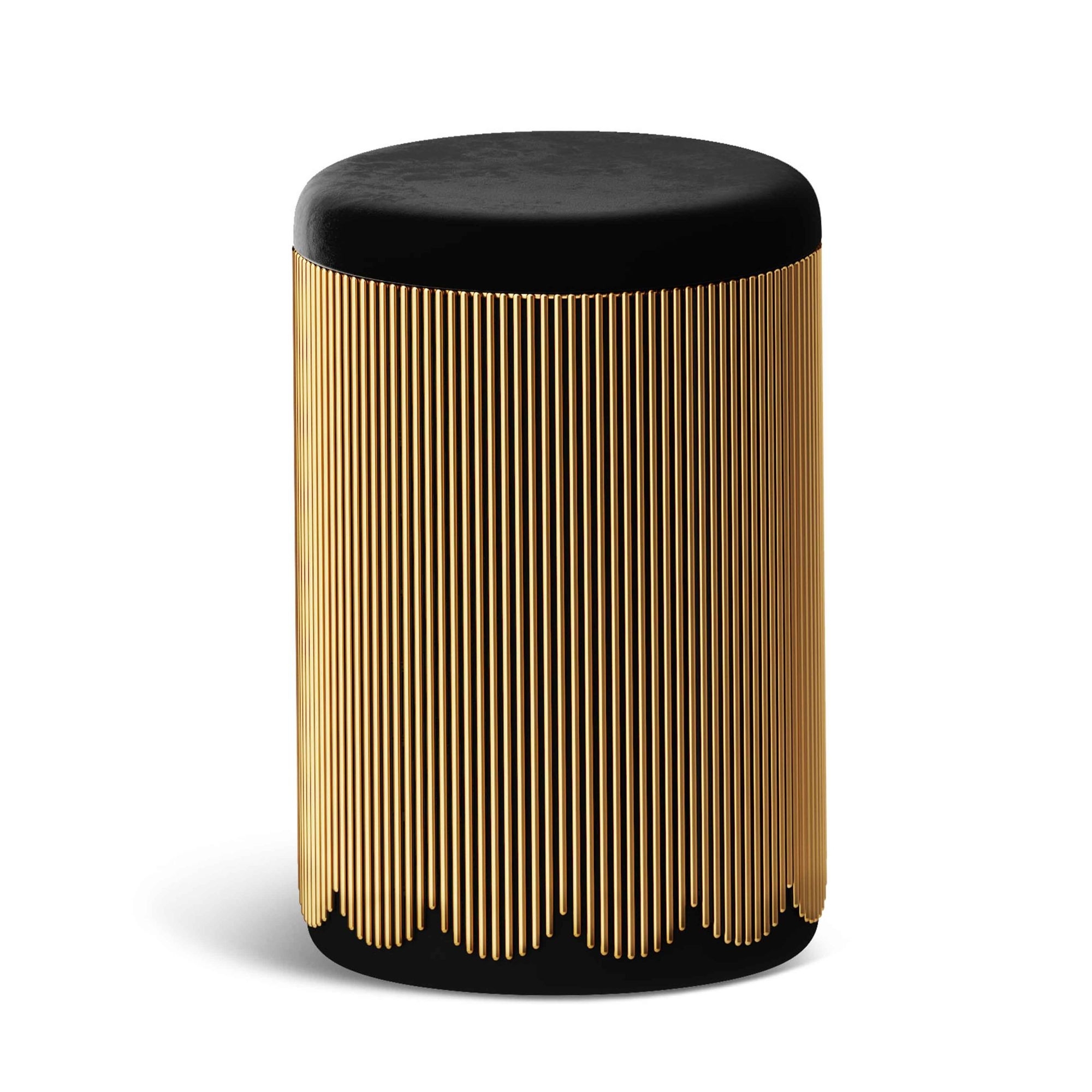 Pouf appartenente alla collezione Strings, dall'altezza di 45 cm. Un animo glamour e innegabilmente moderno, questo magnifico complemento è contraddistinto da una superficie in tonalità ombrose, impreziosite da un bordo in metallo dorato che ricrea l'effetto del pizzo, donando interesse visivo, un lussuoso contrasto cromatico, e una dose di femminilità che non può mancare in ogni tuo spazio. Disegnato da Nika Zupanc per Scarlet Splendour