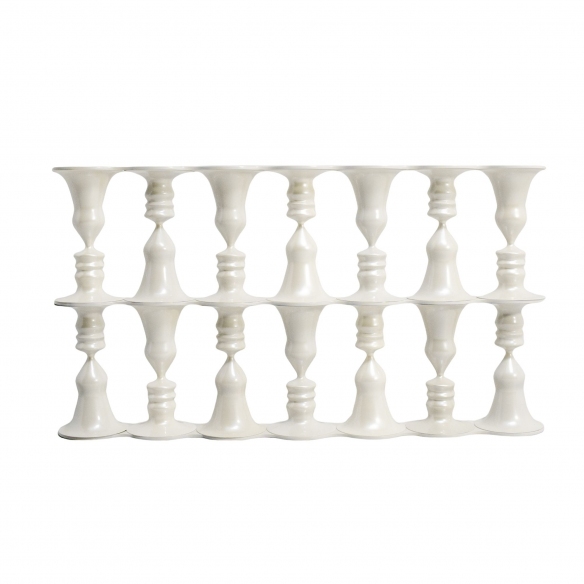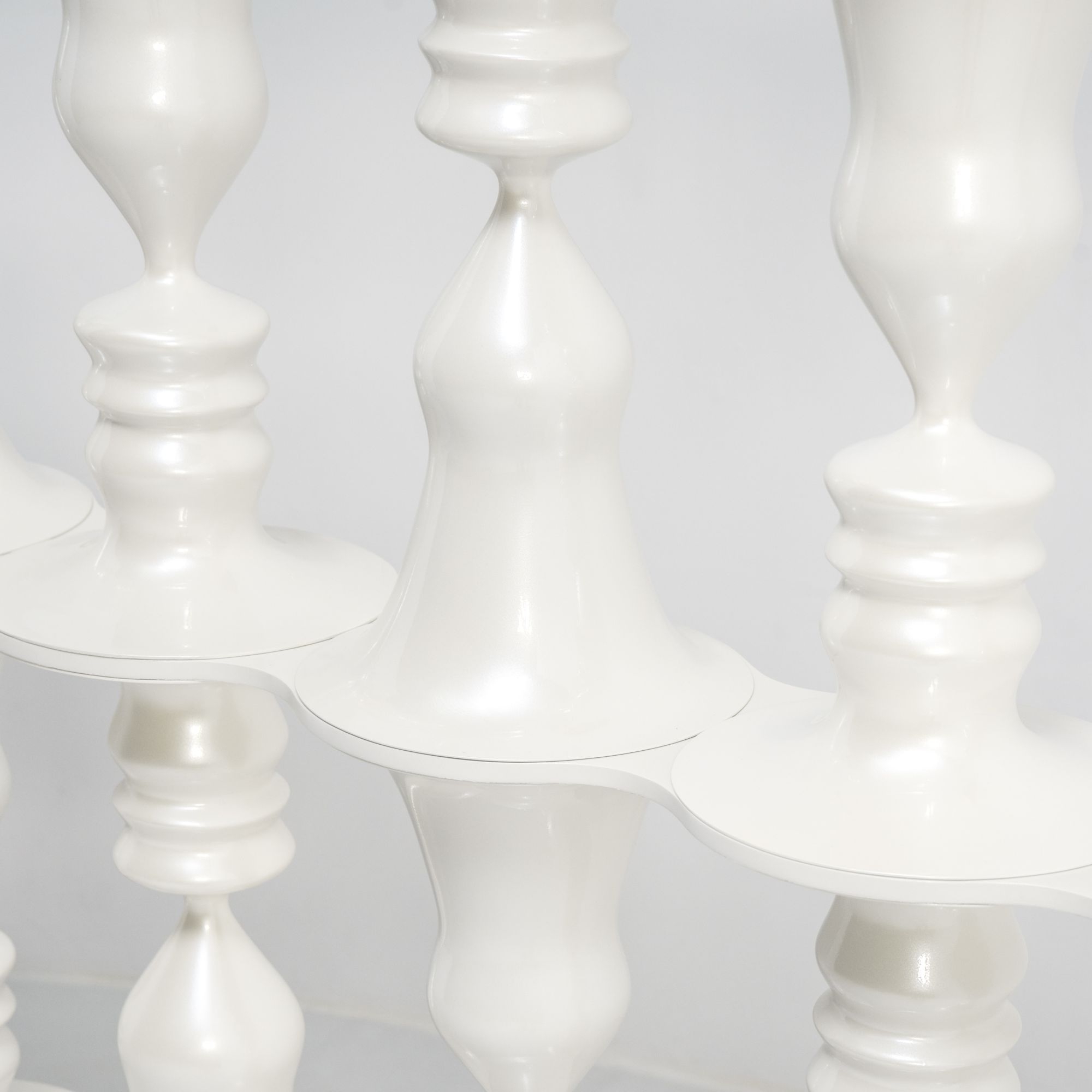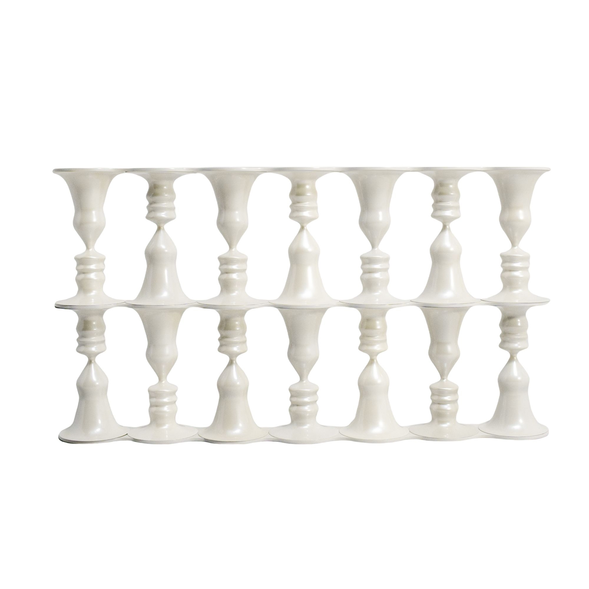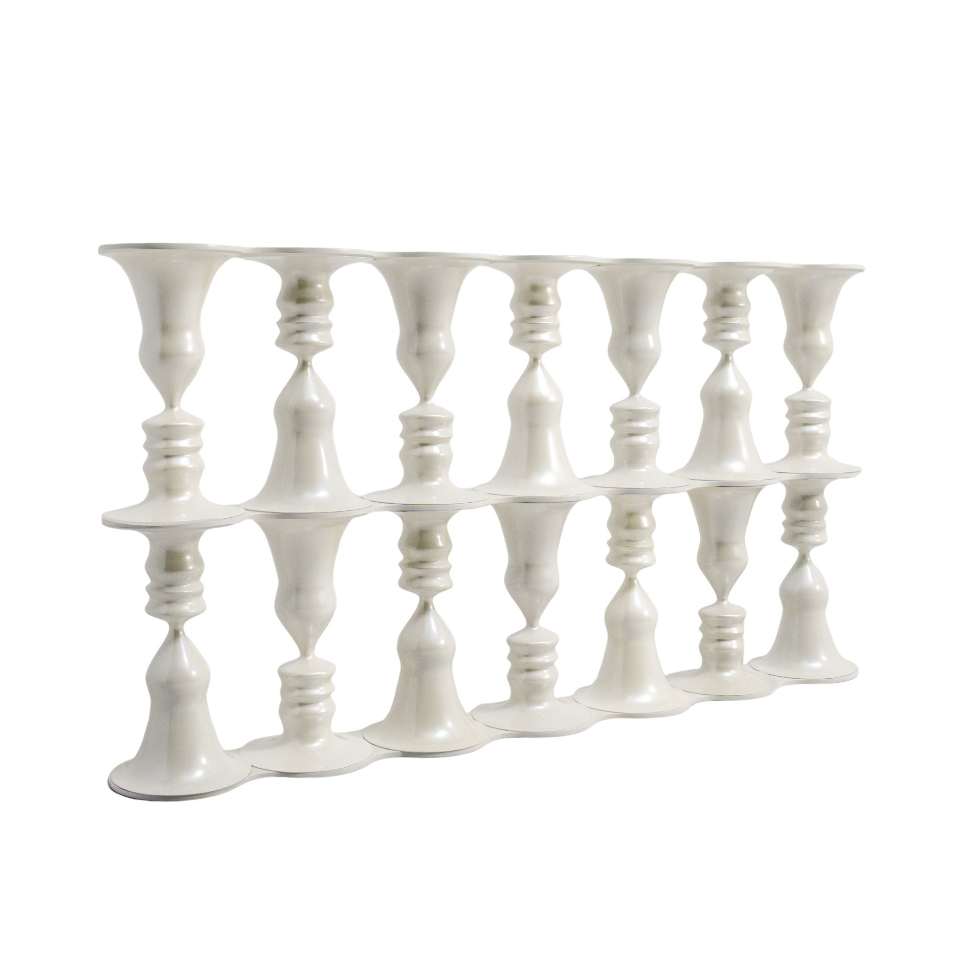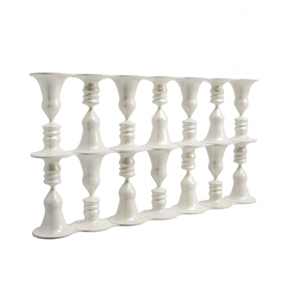 Paravento appartenente alla collezione Ego, dall'altezza di 104 cm. Una creazione innovativa, una struttura metallica con effetto madreperla utilizzata con stile e carattere, sia da sola che come parte di un progetto di interior design, che permette di creare soluzioni diverse, mantenendo sempre un alto livello di eleganza e aggiungendo un carattere suggestivo all'arredamento. La forma scultorea è estremamente contemporanea ma dal fascino senza tempo. Disegnato da Karim Rashid per Scarlet Splendour