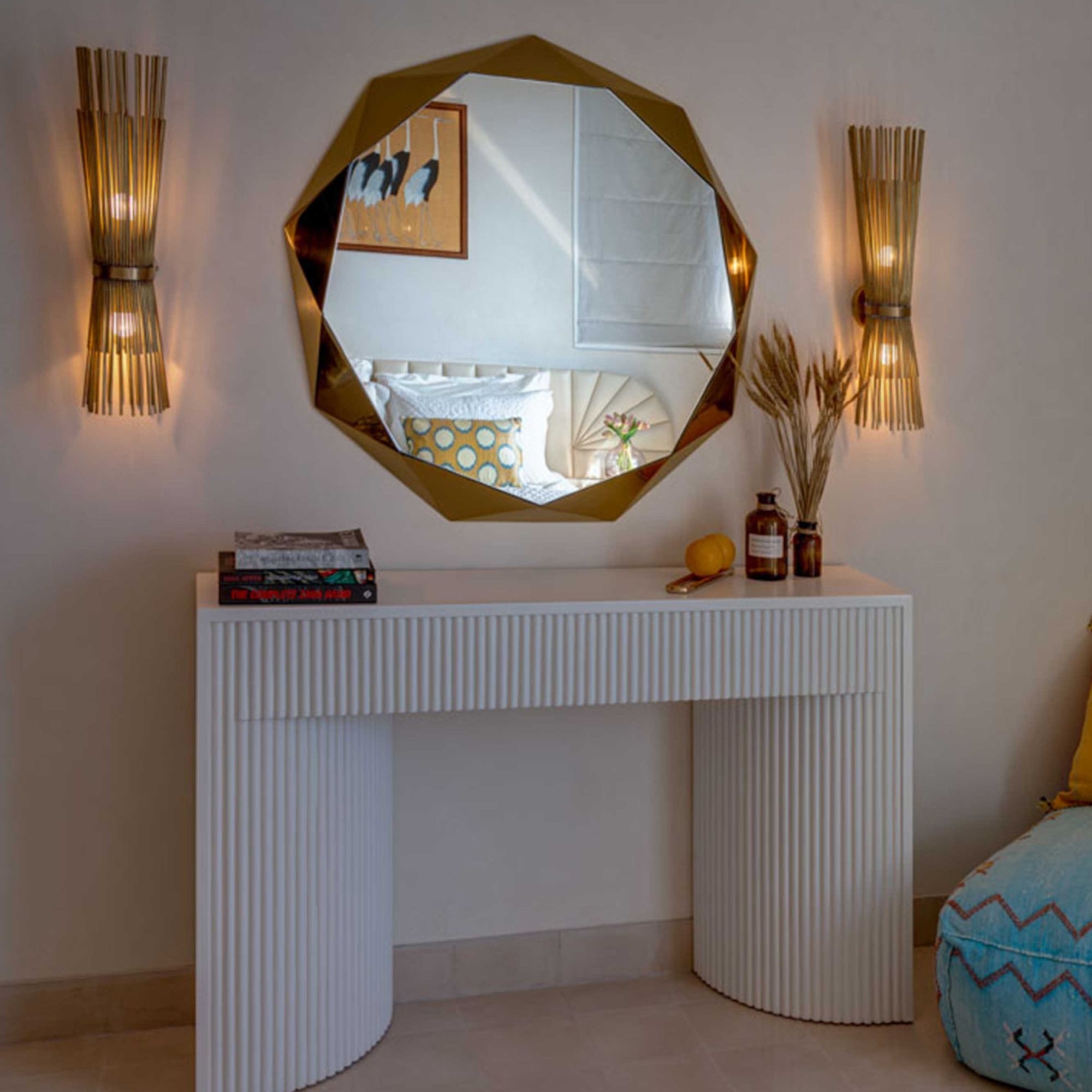 Specchio Stella in versione Small, appartenente alla collezione 88 Secrets, dalla lunghezza di 92 cm. Un design glamour e in linea con le ultime tendenze dell'arredamento, lo specchio Stella a forma di diamante è un capolavoro moderno che gioca con riflessi di luce. Ha lussuose sfaccettature lungo la sua cornice metallica, con una magnifica finitura in oro e oro rosa che enfatizza un'eleganza tutta femminile. È audace e quello che serve per uno spazio moderno. Disegnato da Nika Zupanc per Scarlet Splendour