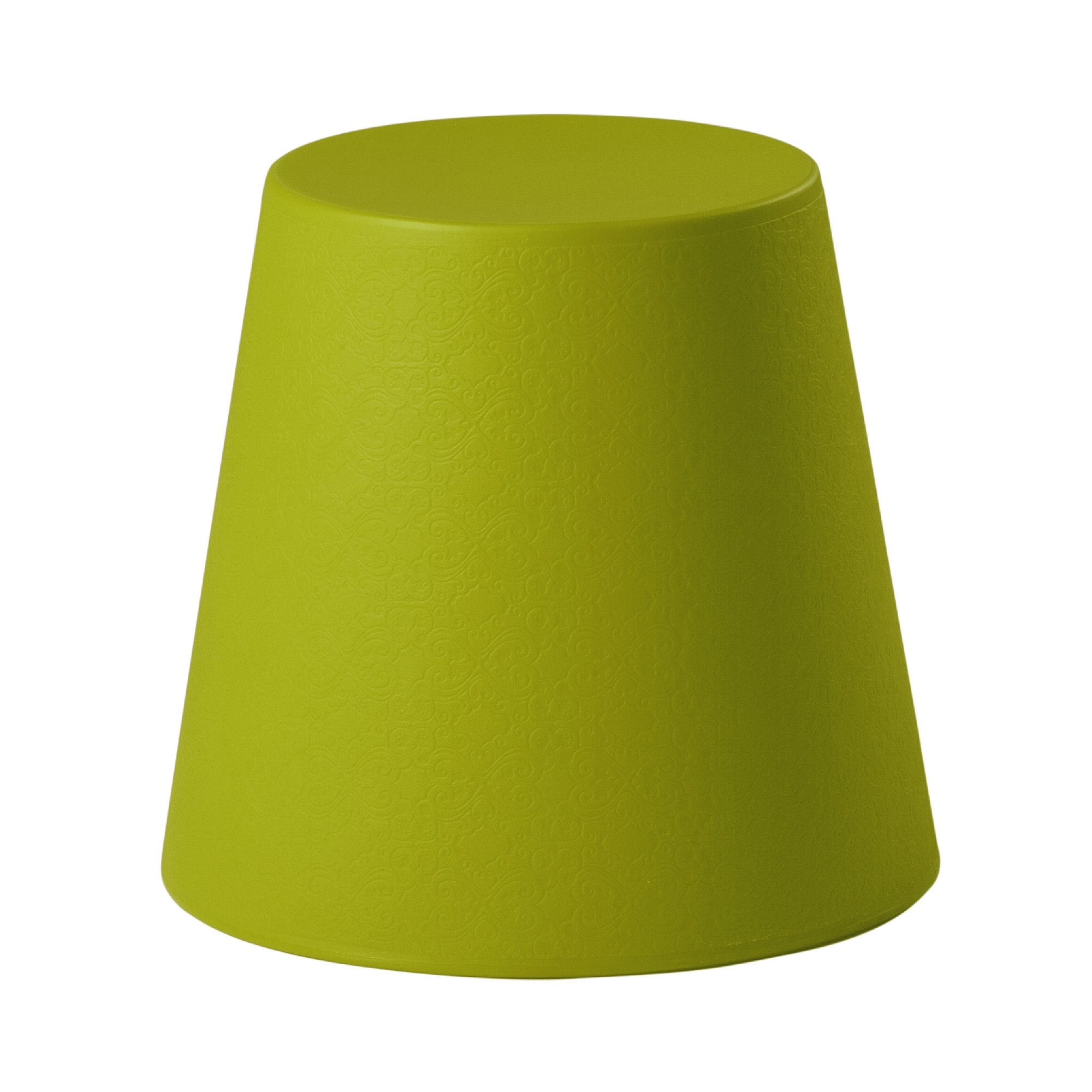 Sgabello realizzato in polietilene, appartenente alla collezione Ali Baba, dall'altezza di 41 cm. La peculiare forma ricorda un classico paralume delle lampade della tradizione e conferisce all'oggetto un aspetto raffinato e contemporaneo grazie alla piacevole fluidità delle sue linee che lo rendono particolarmente adatto a contesti moderni e di design. Con un'ampia gamma di colori tra cui scegliere, questa graziosa seduta cattura lo sguardo per lo splendido motivo damascato, ricco di particolarismi e ghirigori, che prendono vita quando la luce si infrange su di essi, donando ulteriore ricercatezza estetica e interesse visivo. Disegnato Giò Colonna Romano.