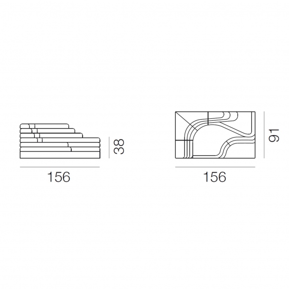 Dimensioni: Lunghezza 156 cm, Larghezza 91 cm, Altezza seduta 38 cm, Altezza totale 70 cm